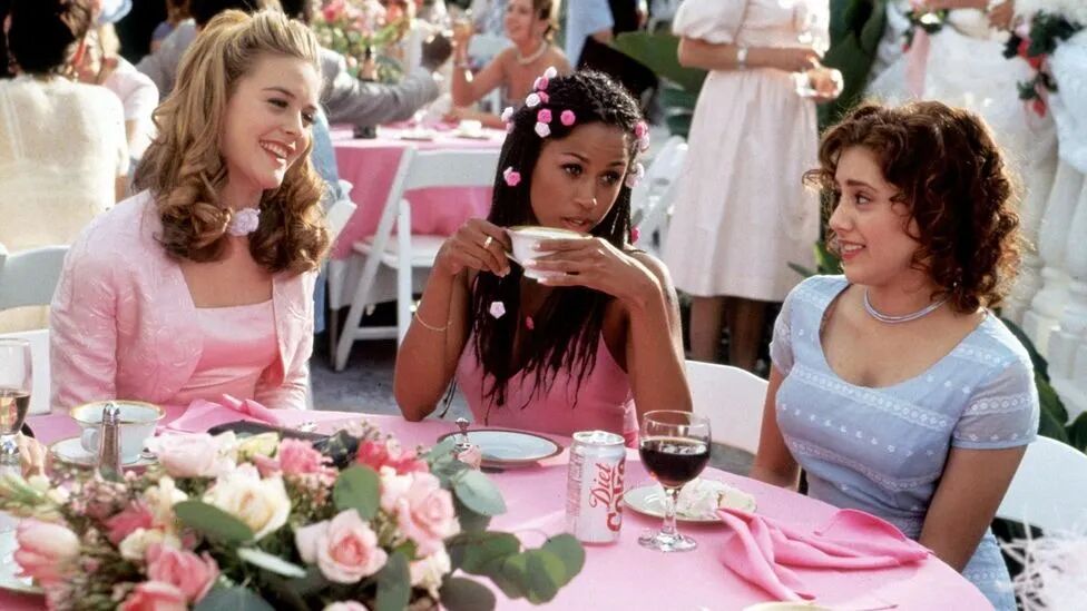 在第二季中,Cassie一直处于“恋爱脑”状态,为了讨Nate欢心故意打扮成Maddy的样子,她会想把自己打扮成Bridget Bardot和Claudia Schiffer。(两个人都是当时杂志上频繁出现的经典美式美女) Cassie的造型被称为“Oklahoma Look”,因为Oklahoma在美国文化中一直是乡村感的、守旧的代名词。Lexi在学校中抗议排演音乐剧《Oklahoma》就是因为,她觉得这部舞台剧太老派守旧。那么为什么一定是粉色才代表了女性没有主见、恋爱脑的样子?这就不得不提到了在好莱坞电影中的Silly Girl形象,像《贱女孩》《独领风骚》这样的小妞电影中,总有一个穿着粉色套装、有点笨的金发美女。或许你会说Jules也有很多粉色造型,但Jules在第二季中意识到自己不再需要所谓“女性化”外壳的加持,首先她剪掉了粉色漂染长发,而且她的造型出现了更多的裤装。