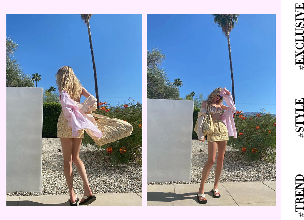 色彩呼应编辑已经说累了。Elsa靠一双高跟拖鞋和一只手袋的加持,就让整套穿搭变得更有层次感。