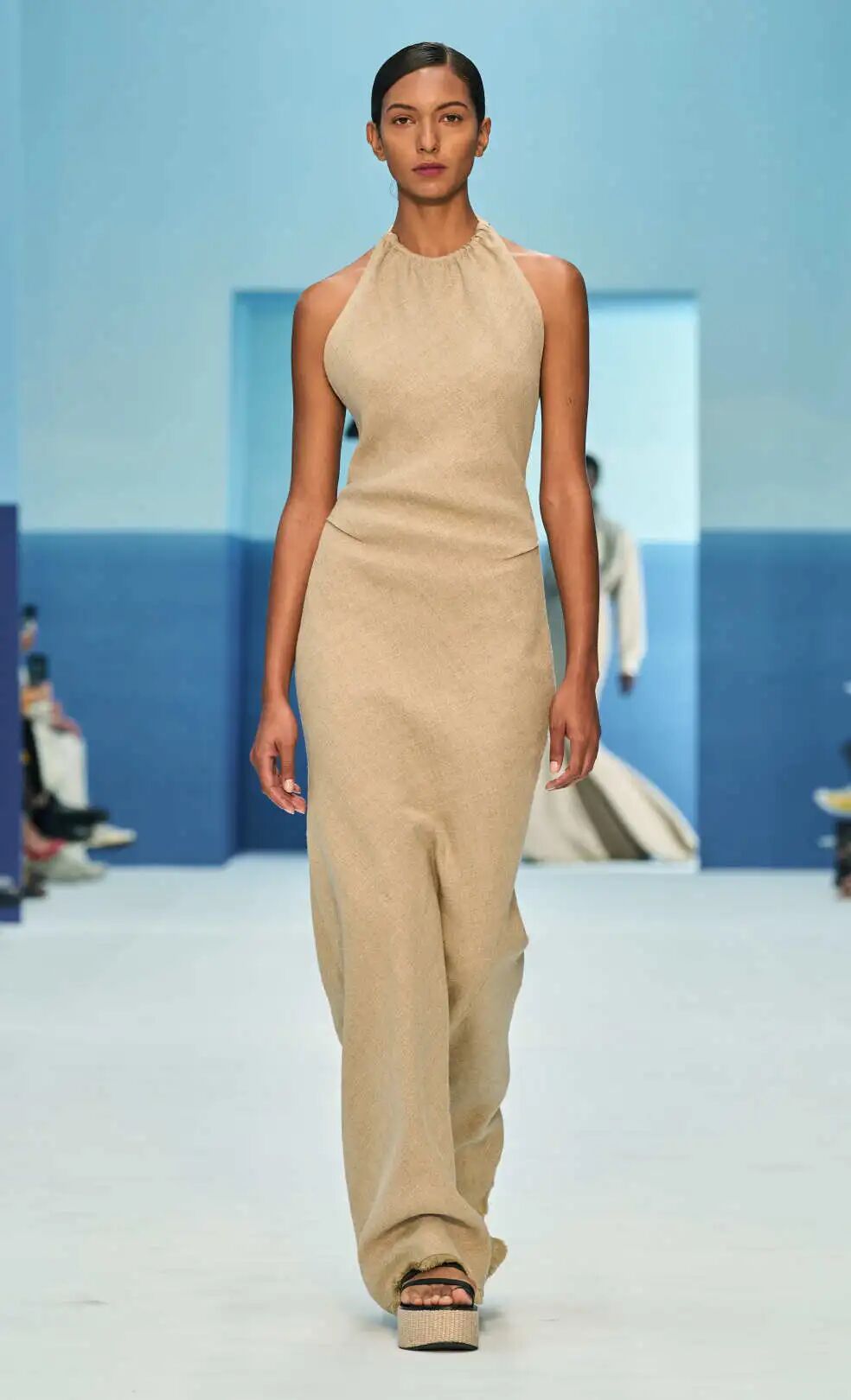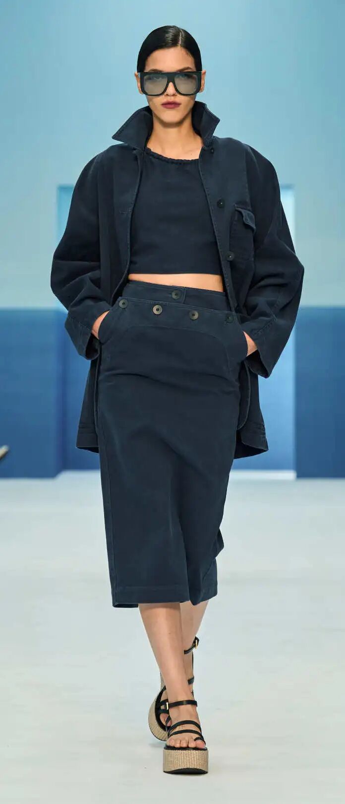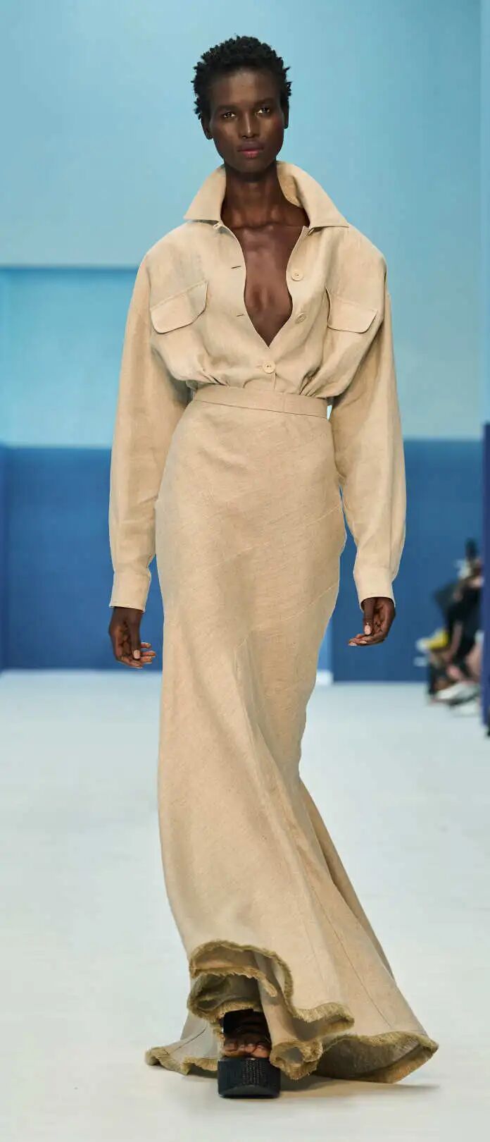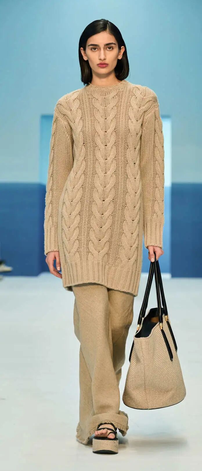 剪裁流畅的裙摆保留着流苏毛边似乎拉近了我们与自然的距离。本次Max Mara放弃丝绸、蕾丝等华丽精致的面料,让斜纹棉布和针织成为主角,造型的张力不必用复杂的廓形与奢华的面料高呼,低吟的诉说更为动人。