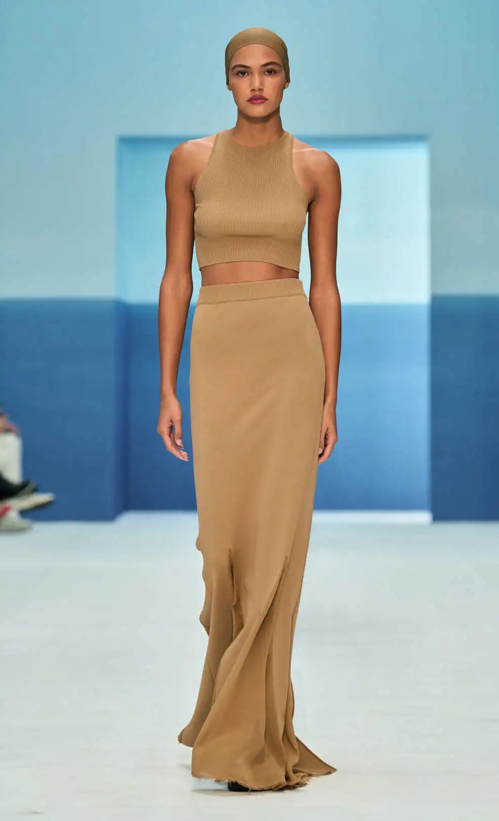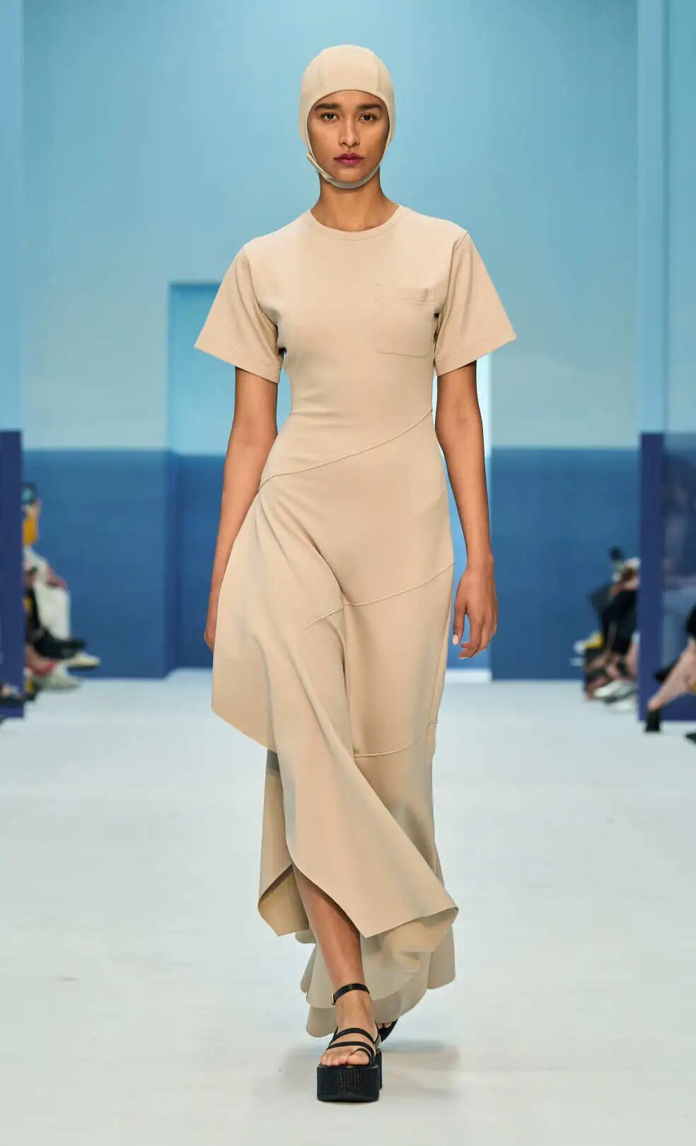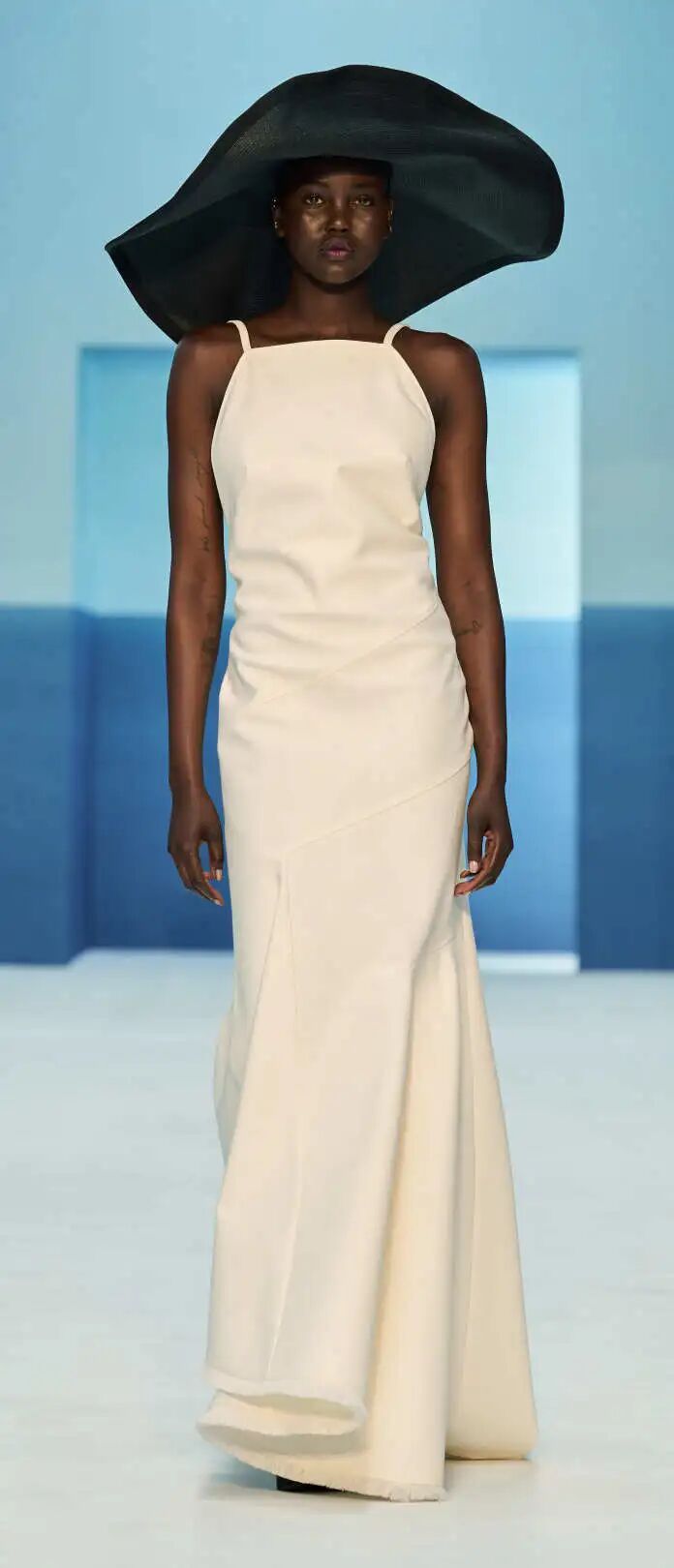 剪裁流畅的裙摆保留着流苏毛边似乎拉近了我们与自然的距离。本次Max Mara放弃丝绸、蕾丝等华丽精致的面料,让斜纹棉布和针织成为主角,造型的张力不必用复杂的廓形与奢华的面料高呼,低吟的诉说更为动人。