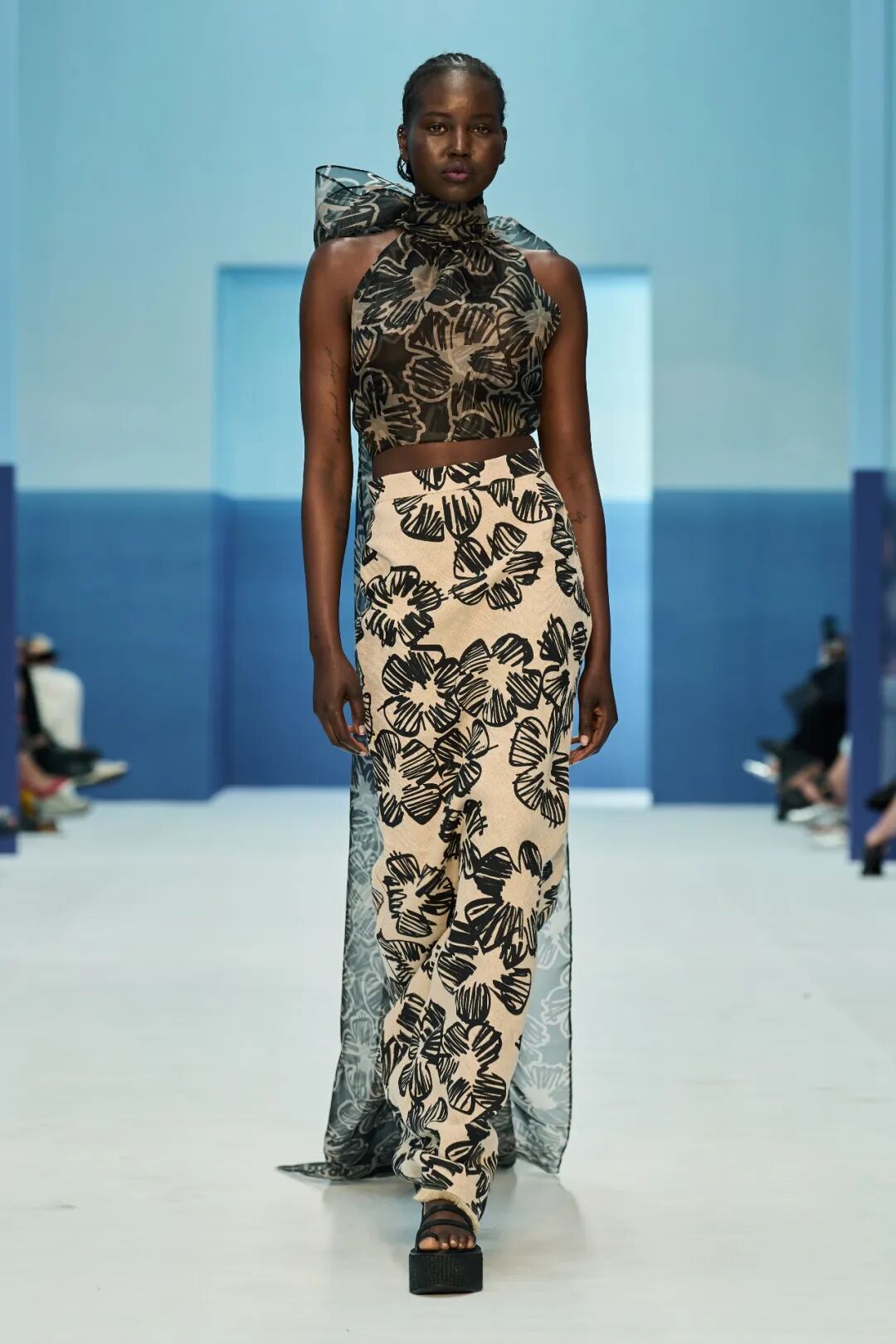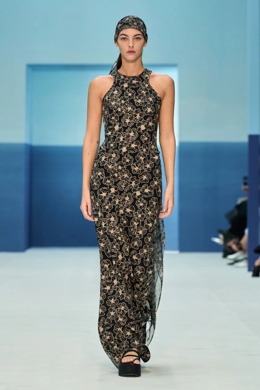 富有浓郁珀尔风情的南法乡村艺术风格花卉保留着手绘的童趣质感,铺满在亚麻或是薄纱之上,薄厚两种材质之间,印花展现出截然不同的视觉效果。欧根纱轻覆在身体之上,由脖颈间向后延展形成长长的拖尾,不断蔓延,直至消失在海平线。