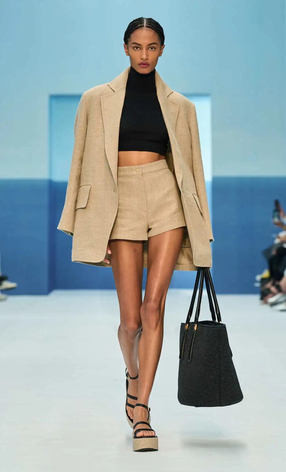 色彩是时尚中最简单也是最复杂的议题。Max Mara在本季寻找海天一色之间被忽略的色彩与光晕,属于沙滩的沙砾色用白色调和,衍生出深浅不一的粽。而黑与白之间又有怎样的可能?