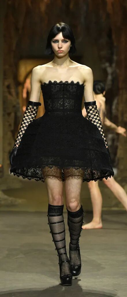 若隐若现的紧身带(GUÊPIÈRE)勾勒出迷人轮廓,令人联想到Catherine de Medici时代宫廷内盛行的宽大礼服裙。