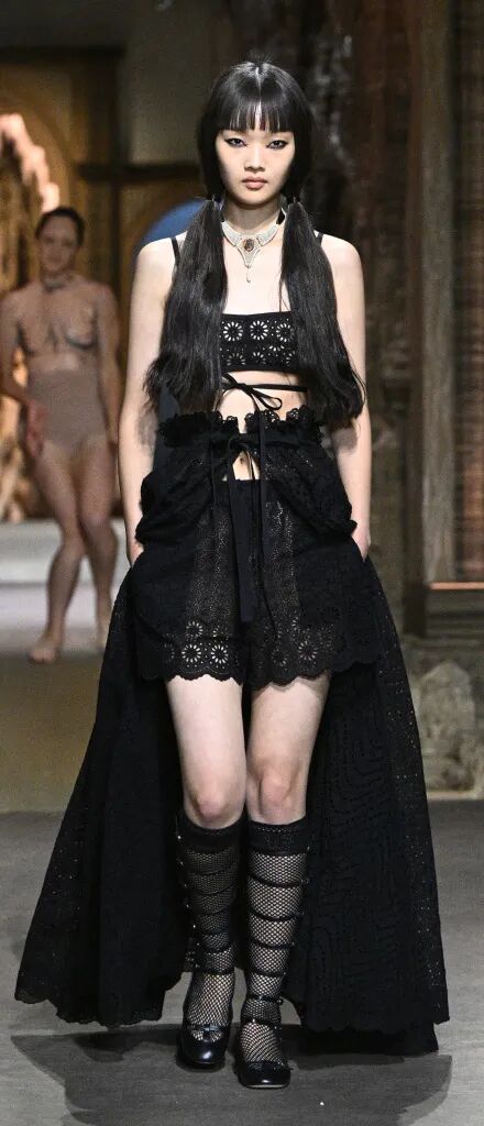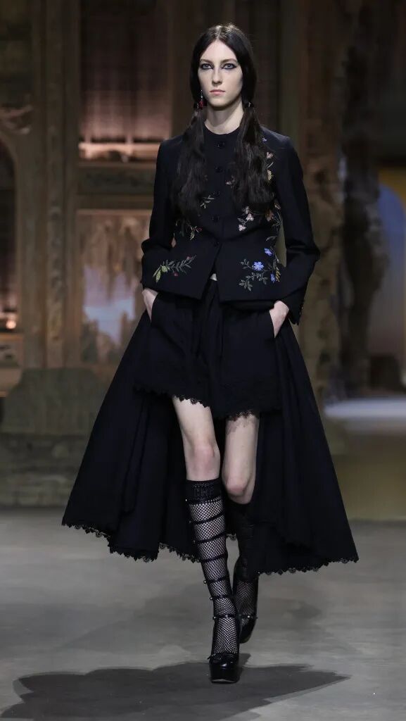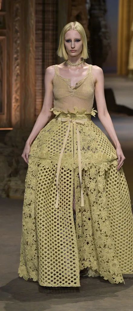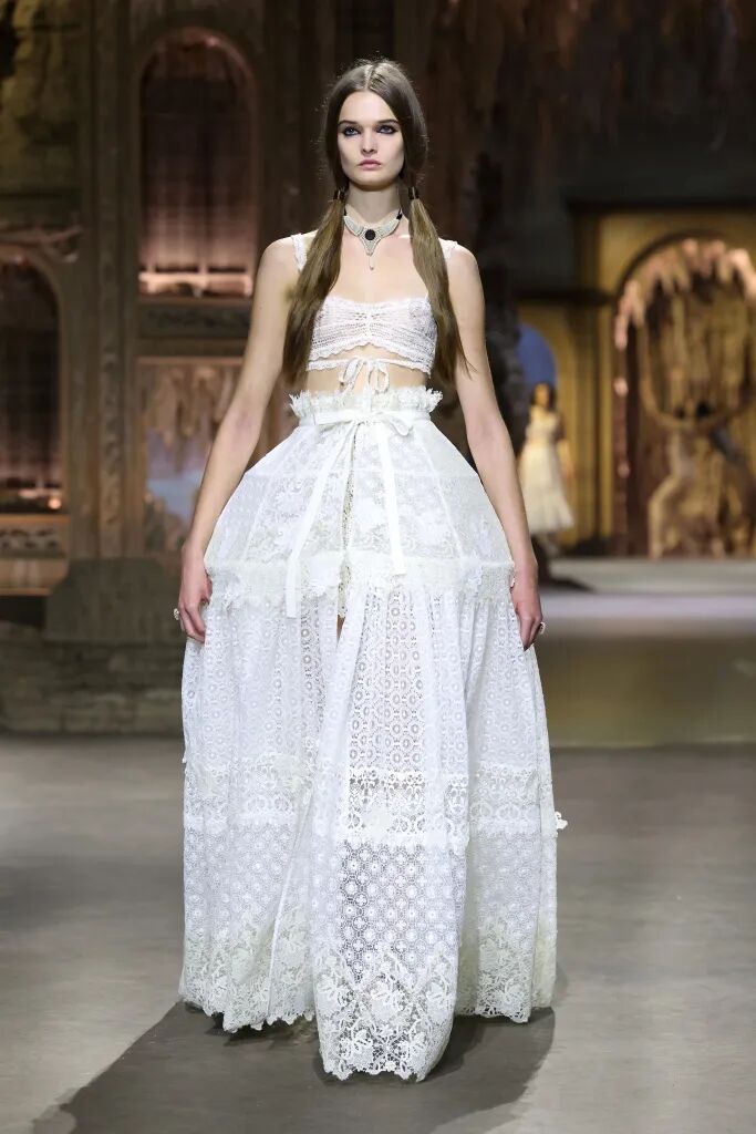 Chiuri以挺落的硬纱、层层刺绘的蕾丝重新解构大体积裙摆带来的厚重感,减少层次或精短裙摆,露出如克里诺林裙撑一般的“骨架”,使之变得轻盈与易穿。