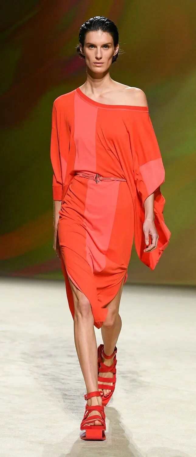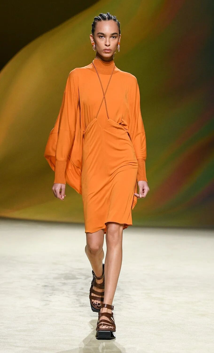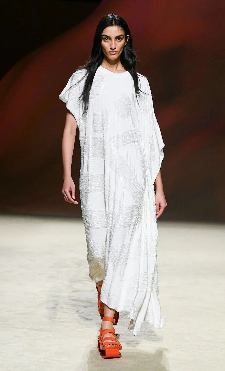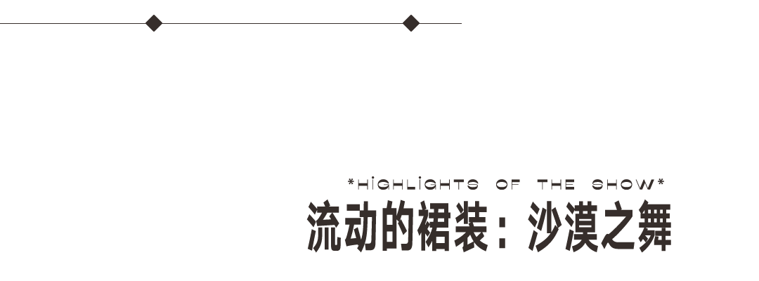 在沙漠中翩然起舞时,飘逸的修长装束勾勒出身体的优美曲线,飘逸的面料宛如旗帜飞扬,呈现出一种流动的美感。这是自然的律动在身体上的体现。透明的薄纱与柔软的布料结合,充满了呼吸感,贴身而轻盈的材质也诠释了Hermès式优雅女性的奥义:松弛感。
