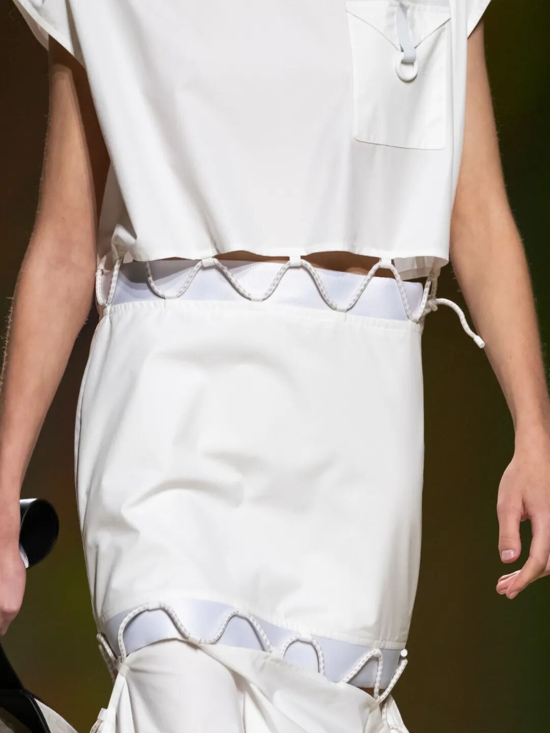 呼应帐篷元素的编结绳索是本季令人惊喜的元素。它以腰带、缀饰、拉链等方式融入长裤、短裤和夹克等单品,搭配金属环扣等巧妙地碰撞出机能风。但这不仅是单纯的风格创新,更透露出Hermès对时装的哲学思考。在服装上加上帐篷绳索就好比呈现了一个隐喻:就如同帐篷是人在露营时与自然亲近的住所一般,衣着其实也是人面对外界时最亲近的住所,通过作为媒介的时装,我们与世界和生灵发生对话。