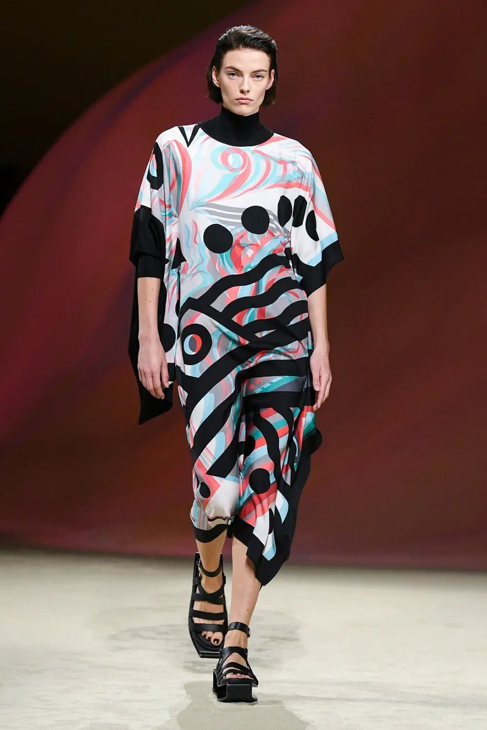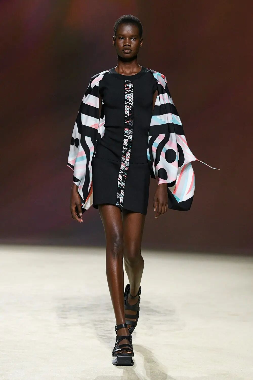 线条与几何亦是Hermès的经典印花形态。本次三维立体印花连衣裙上的印花,让身姿与线条完美交融。逗号、圆圈、线条等十分活泼,搭配明亮的蓝粉色调,是内心悸动的抽象符号,充满欢愉的跃动感。黑白色系则别有一种神秘艺术感。