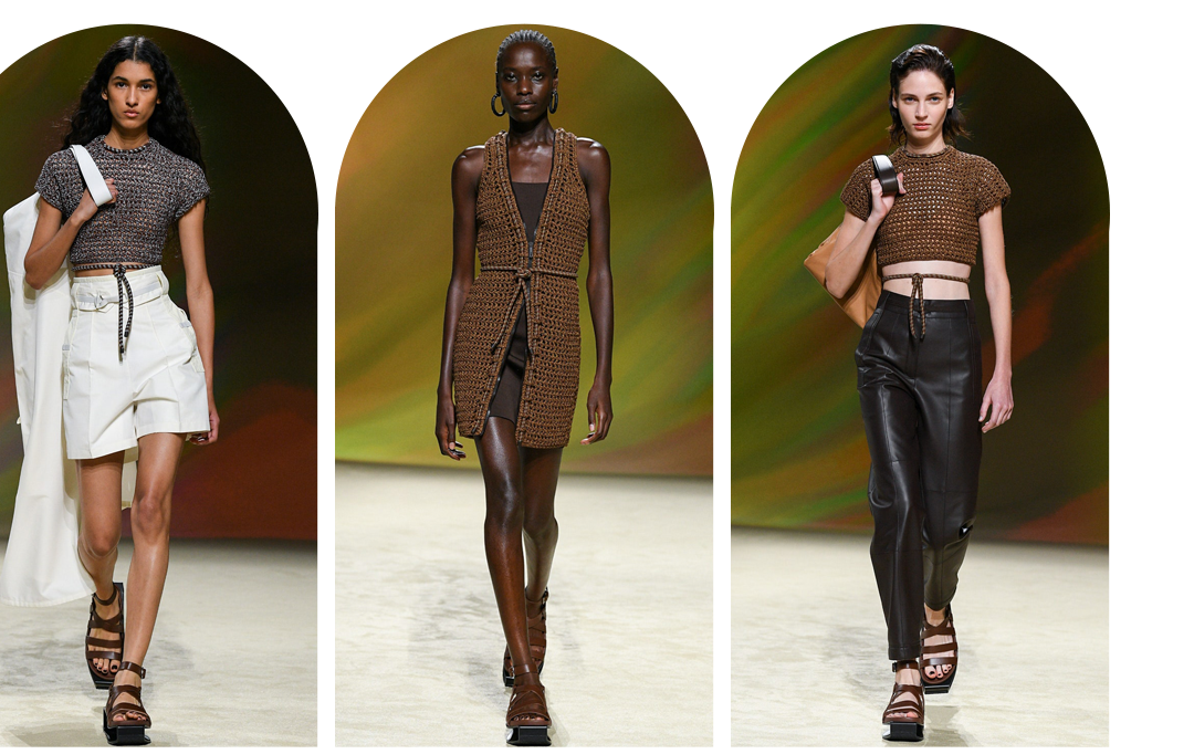 仿佛从编网、吊床抑或纱窗直接裁下般的服装材质,也是对沙漠露营主题的丰富延展。粗犷的镂空绳编、颇具波西米亚流浪风格的编织、圆片材质等呈现出未经雕饰的原生美感,展现了爱马仕女性之美中狂野的一面。