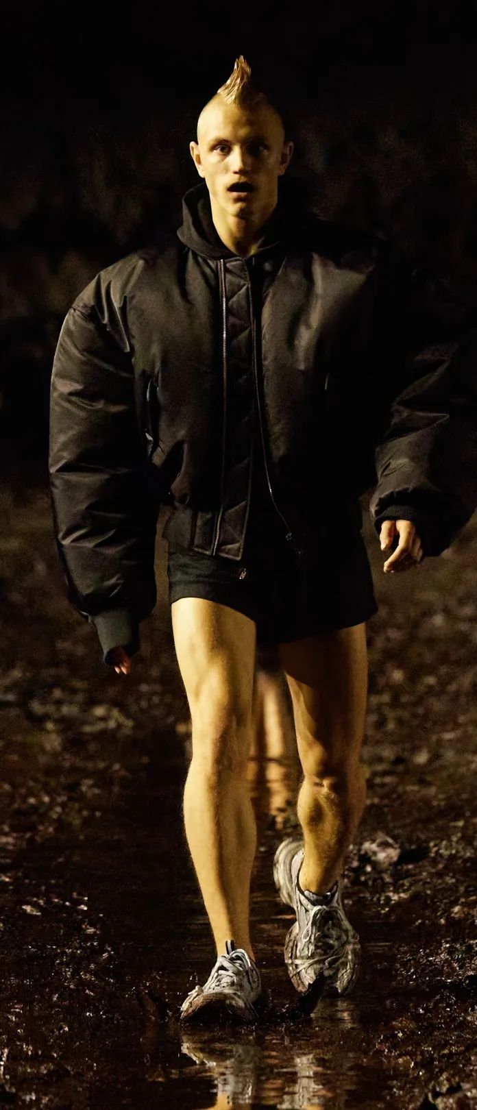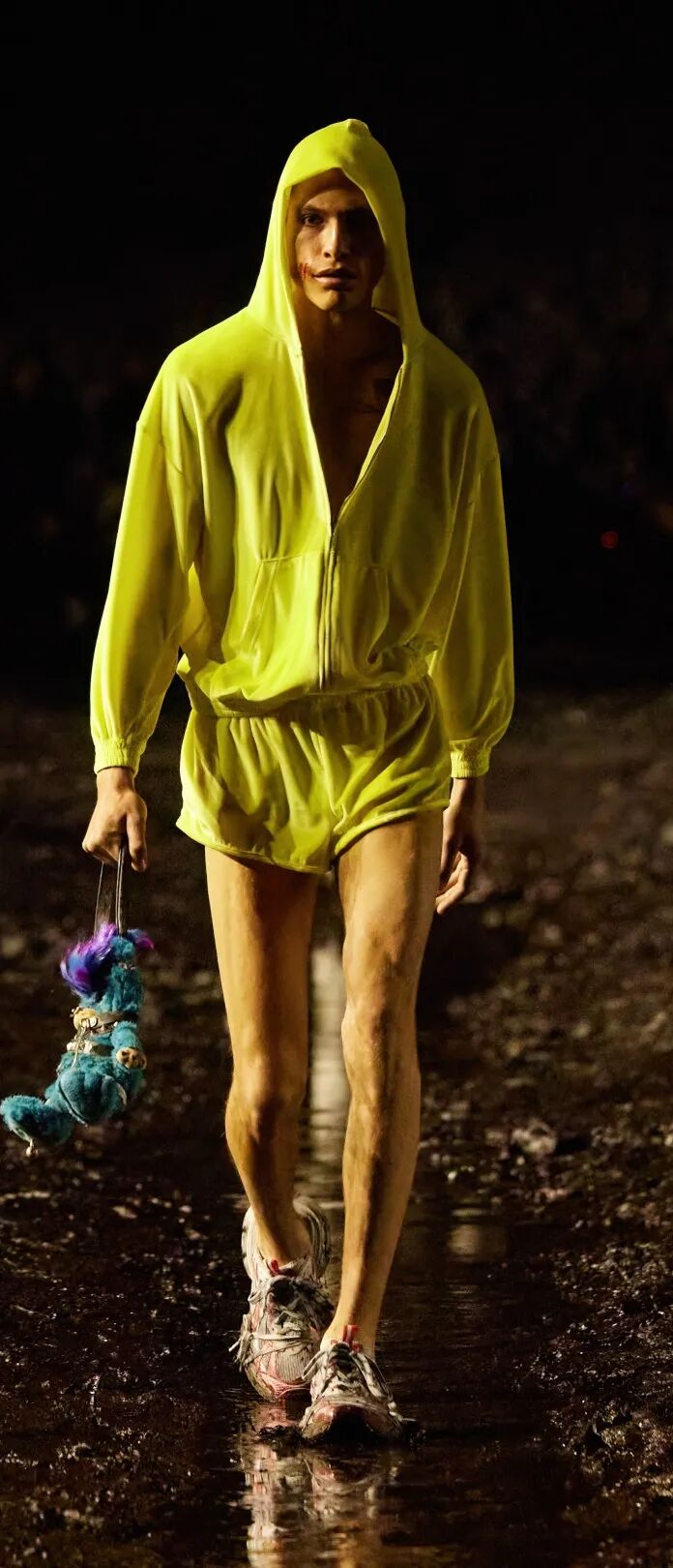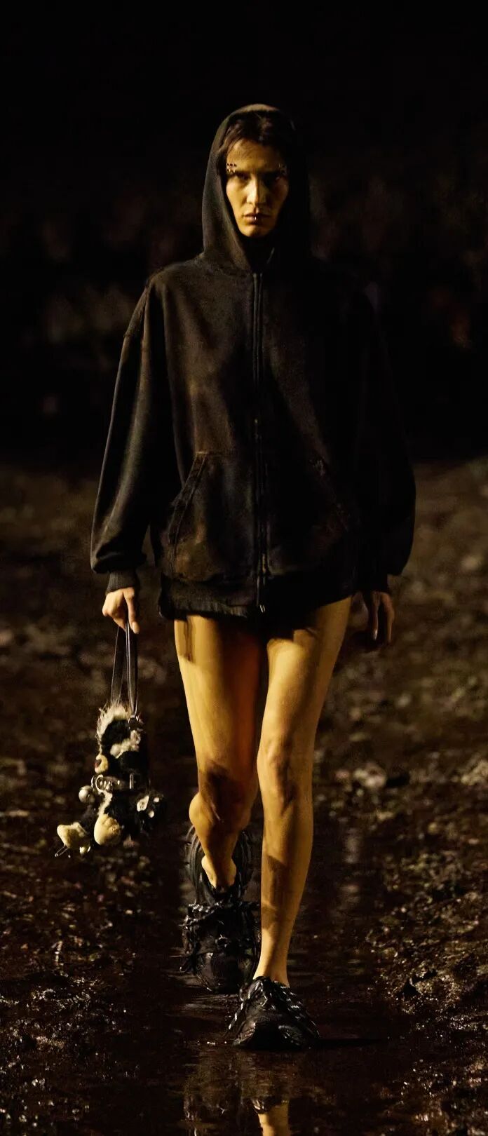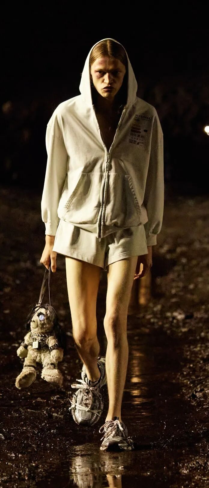 连续出现的连帽衫与超短裤的组合一次次挑动着观众的视觉神经。几乎没有任何设计,并且像是从旧衣回收站回收而来般松垮。不少观众在秀场视频的弹幕里写下了对这场秀的理解,即“我不理解”。关于什么是时装,什么才是时装,Demna留下了一个开放性的命题,就像他在秀前笔记中写的那样:“时尚是一种视觉艺术,我们要做的就是让人们看见。时尚最好不要贩卖故事。你要么喜欢,要么不喜欢。”