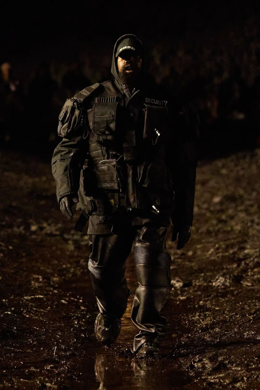 伴随着激进的电子乐,Ye(Kanye West)演绎的第一个Look奠定了大秀的基调,仍旧是Balenciaga的经典廓形,但是更进一步。战术夹克和加厚皮裤的组合带着制服般的肃穆,内搭的套头衫在肩章的衬托下像是开了个黑色玩笑般讽刺,如同来自末日的战士,凌厉、危险且不容靠近。