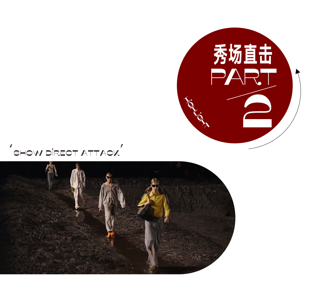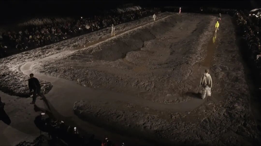 这一季的秀场被布置成雨后的工地,沟壑粗粝而泥泞,混着雨水溅起的泥渍毫不留情地浸湿价格不菲的时装,不由得让人倒吸一口凉气。Balenciaga艺术总监Demna Gvasalia通过此种表达方式,隐喻挖掘真相和脚踏实地的重要性。值得一提的是,秀场所用泥浆来自于法国的泥炭沼泽,这种泥浆有强大的固水能力,将会在秀后进行回收,重新用于景观美化或当地园艺项目。