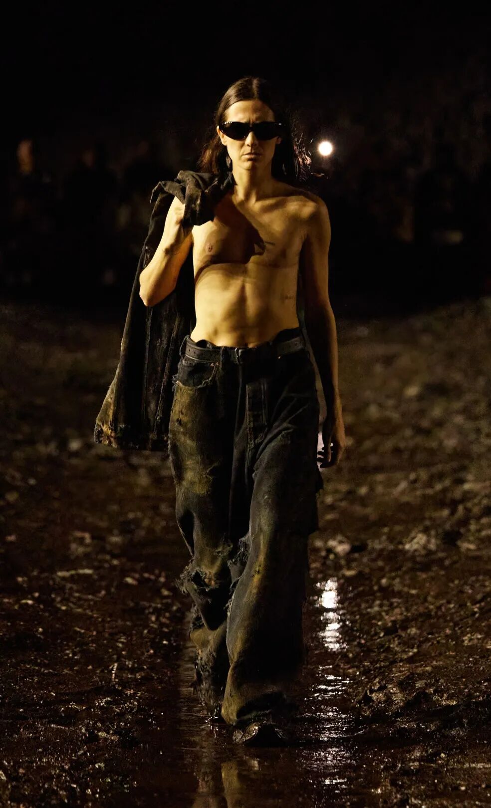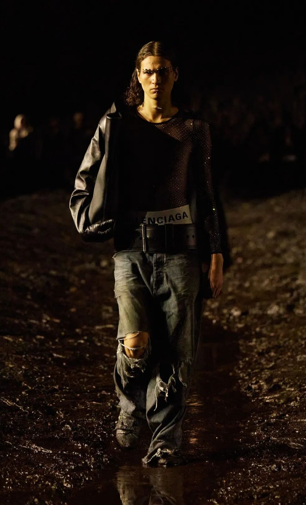 本季Demna将牛仔布进一步做旧,或者已经不能够称之为“旧”,而是“破”。这点在男模特和女模特身上达成了共识,极其松垮的廓形随机点缀着割开的破洞,人为添加的“污渍”真实到令人大为光火。正如Demna所言:“时装是一种工具,它可以帮你伪装或掩饰自己,或者当你要将‘视觉’身份融入生活时助你一臂之力。它的使用方式完全由拥有它的人自行决定。”谁说奢侈品就必须完美精致呢?