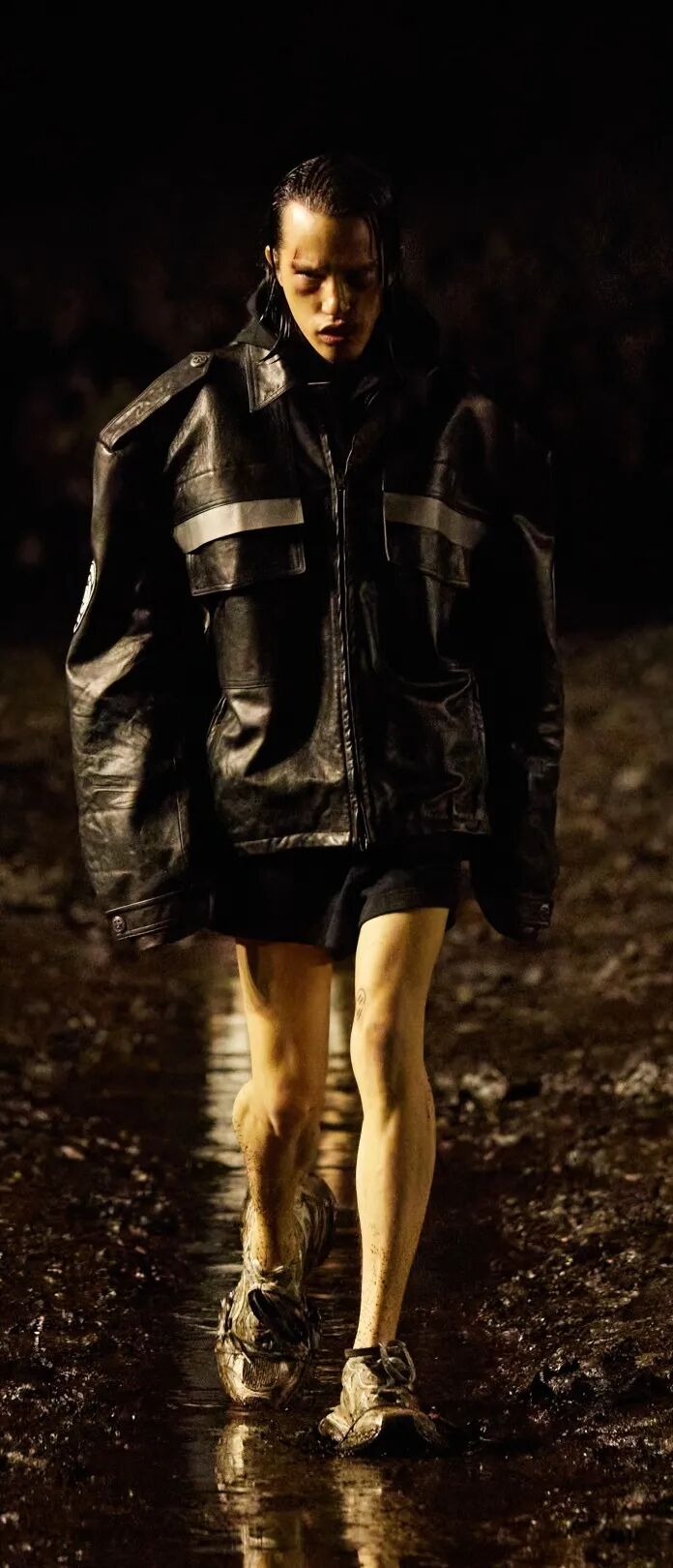 制服元素不断穿插出现在夹克的设计中。飞行夹克被放大填充,塑造出浑圆的肩部廓形;皮夹克同样被放大出比身体更大的尺寸,吞没整个手掌以及上半身,仿佛不是本时代的产物,又像是一栋堡垒,保护着身体免遭环境的伤害,尤其是在如此场景下。