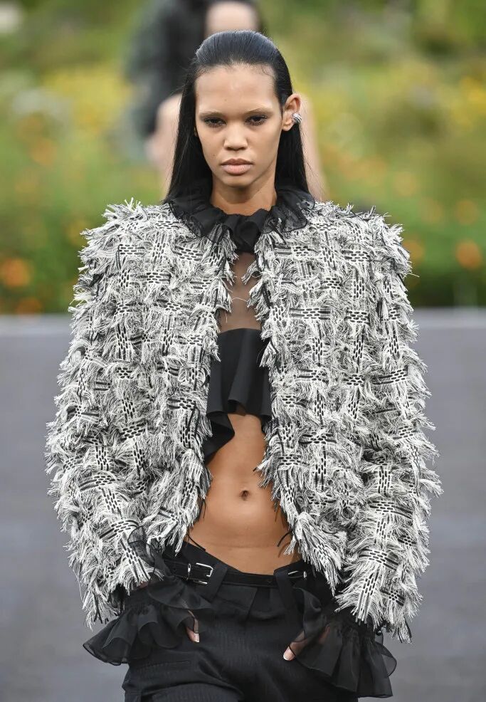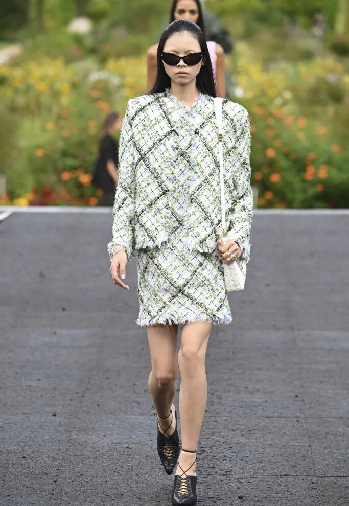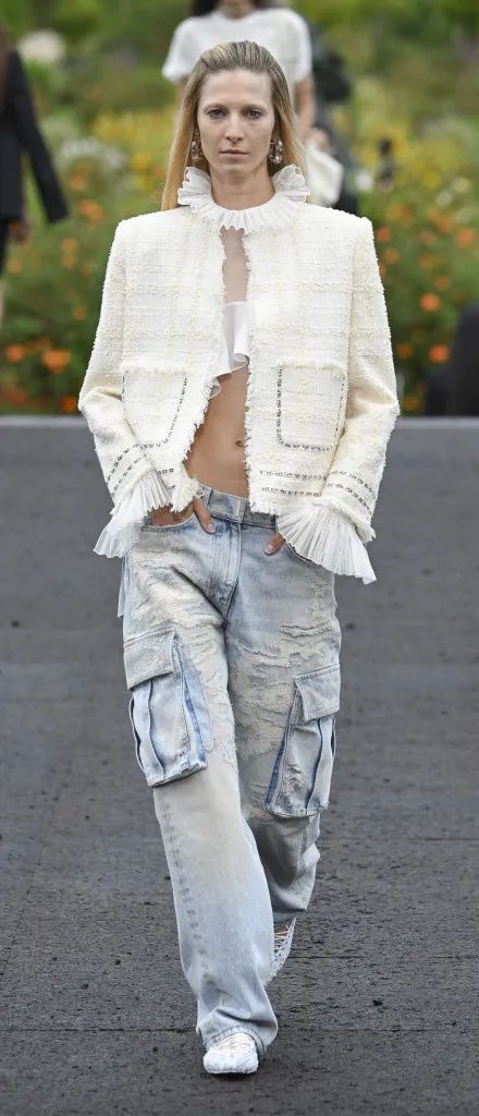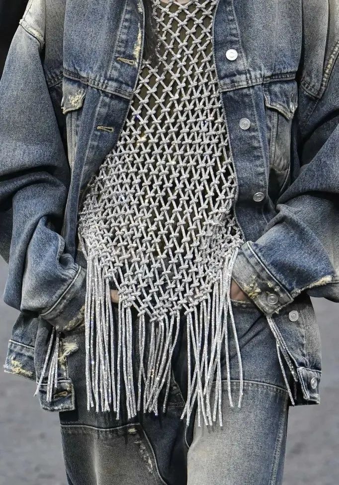 错落有致的粗花呢面料、与胸衣搭配作为上装穿着的薄纱荷叶边短款上衣、搭配了满水晶流苏内搭的破洞做旧处理牛仔套装……多材质混搭的语言更点明本季“文化交融”的理念,谁说女孩们只有一面?她们既可以有巴黎的优雅浪漫,也可以有加州的休闲帅气。