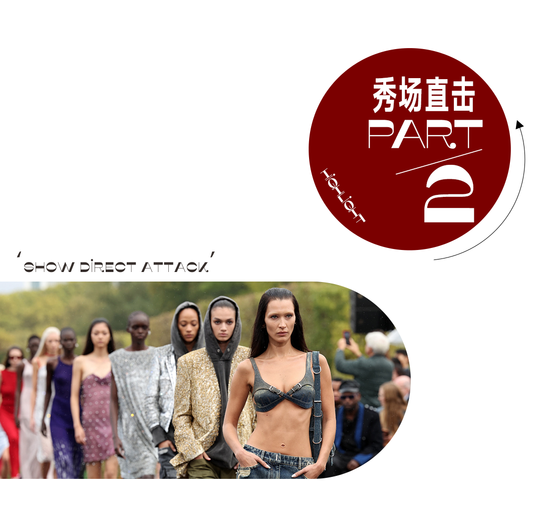 在硬朗的线条里,我们可以看到服装材质同样惊喜地有了更多、更新颖的变化。