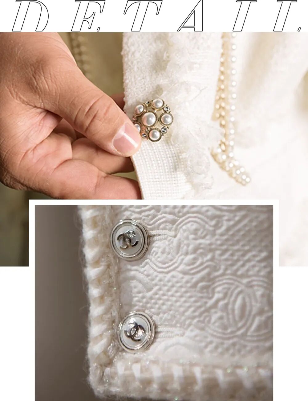 还有精工定制的纽扣、编法考究的滚边、比例恰好的口袋......一件原版CHANEL斜纹软呢外套,能让你上头的完美细节,是上百件平替都凑不齐的,因为精工细作,本就有价。