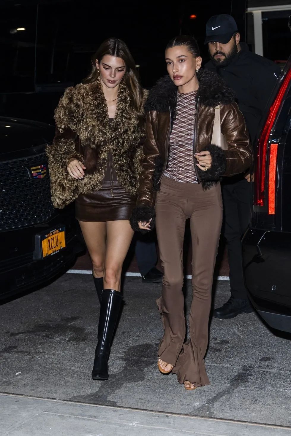除了纯色,棋盘格图案也非常抢眼,一深一浅的错觉拼接,让造型不再沉默拘谨,搭配浅色牛仔裤,温暖中立刻迸发出一丝活跃。比起大面积的毛茸覆盖,Kendall Jenner和Hailey Bieber两人穿着同色系的人造皮草套装,选择了局部毛茸和皮革材质的对撞。Hailey Bieber的巧克力棕色皮夹克,只有衣领和袖口处用羊绒毛作为点睛之笔。与此同时,她用奶油色单肩包点亮了这套造型,与花纹内搭互衬。Kendall Jenner则穿着一件饰有浅棕色环保皮草饰边的毛茸茸棕色外套,同色系咖色上衣则完全隐身在外套中,只为在灯光一闪过的时候,衬托出羊毛质感,以及皮质迷你裙和高筒皮靴的光彩。