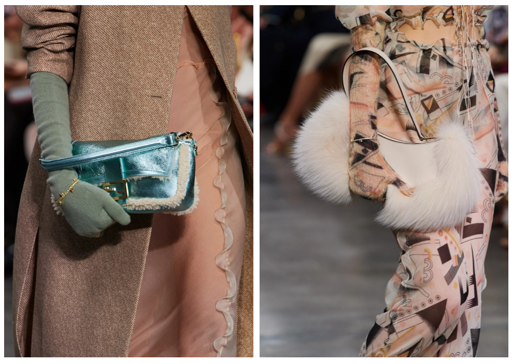 想象一下,即便是在寒冷冬天,但当把手伸进这些可爱的手袋中一刻,也会让你感受到暖意顿生。Fendi 2022秋冬秀场上我们看到一系列经典包型都穿上了毛毛外衣,诸如经典的Baguette手袋、First手袋、Cookie手袋,在原有形态之上,或被勾勒羊羔绒的边缘,或被增加一串红白相间的毛绒条,整个包身被蓬松柔软的毛包裹,显得十分俏皮。