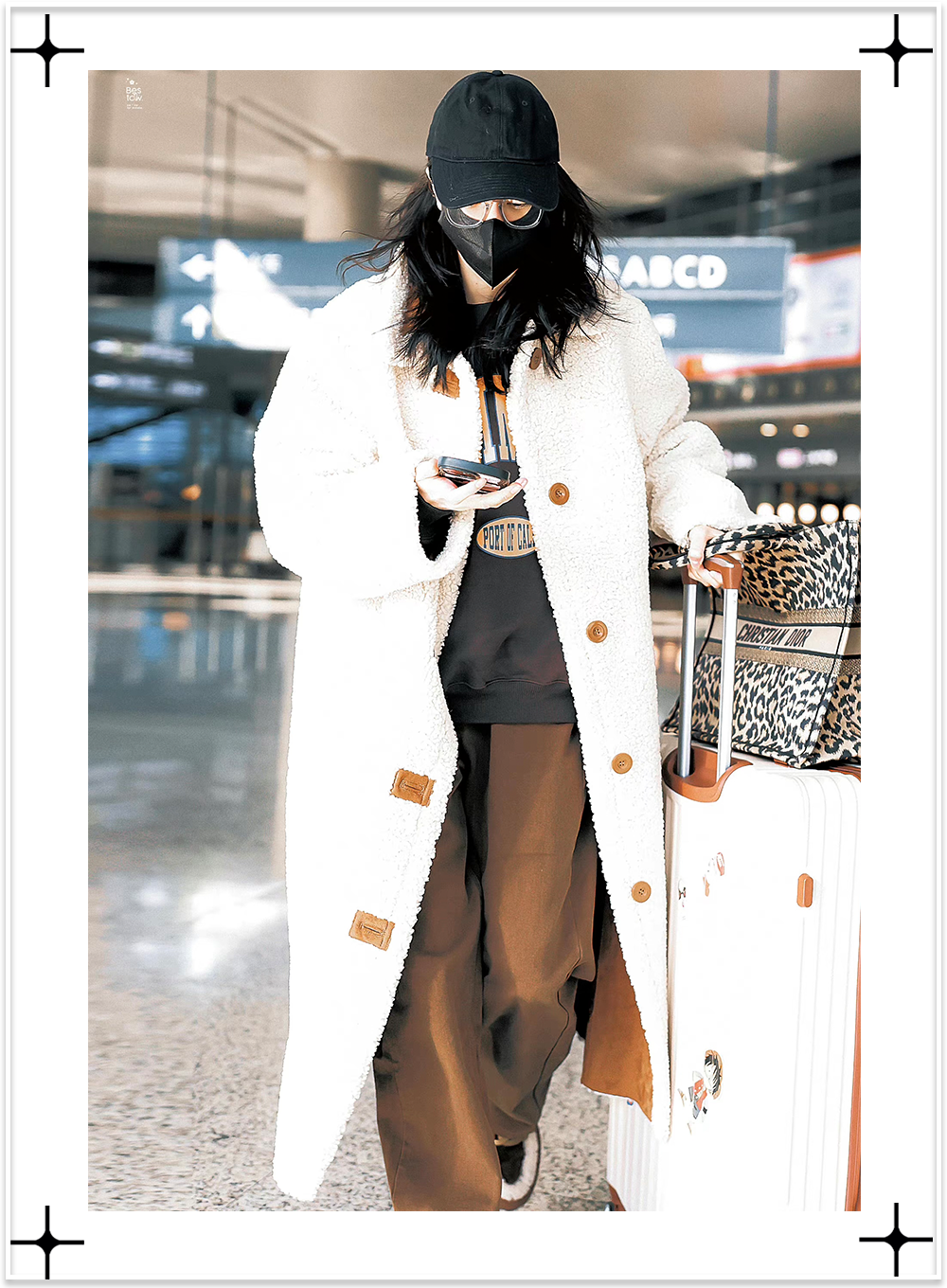 最近,酷爱毛茸质感的迪丽热巴,身着Stand Studio长款翻领羊羔毛外套,内搭一件卫衣与与同色系的直筒裤,小皮鞋上的一圈羊羔毛装饰设计,让她看起来“奶乎乎”的可爱,轻松地维持慵懒舒适感,大衣A字形的直线下摆,也完美地规避了羊羔毛外套的臃肿雷区。