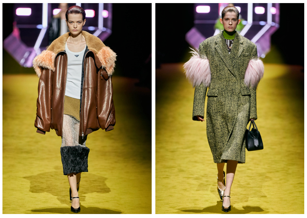 如果你只想让毛毛的元素出现在局部,可以选择向Prada取经。轻盈明亮的毛绒出其不意地衔接于胳膊两侧和肩膀两侧,与不同颜色质地的粗呢大衣和皮衣对撞混搭,既保持了衣服的原生状态,又小小地撒娇出一点惬意。