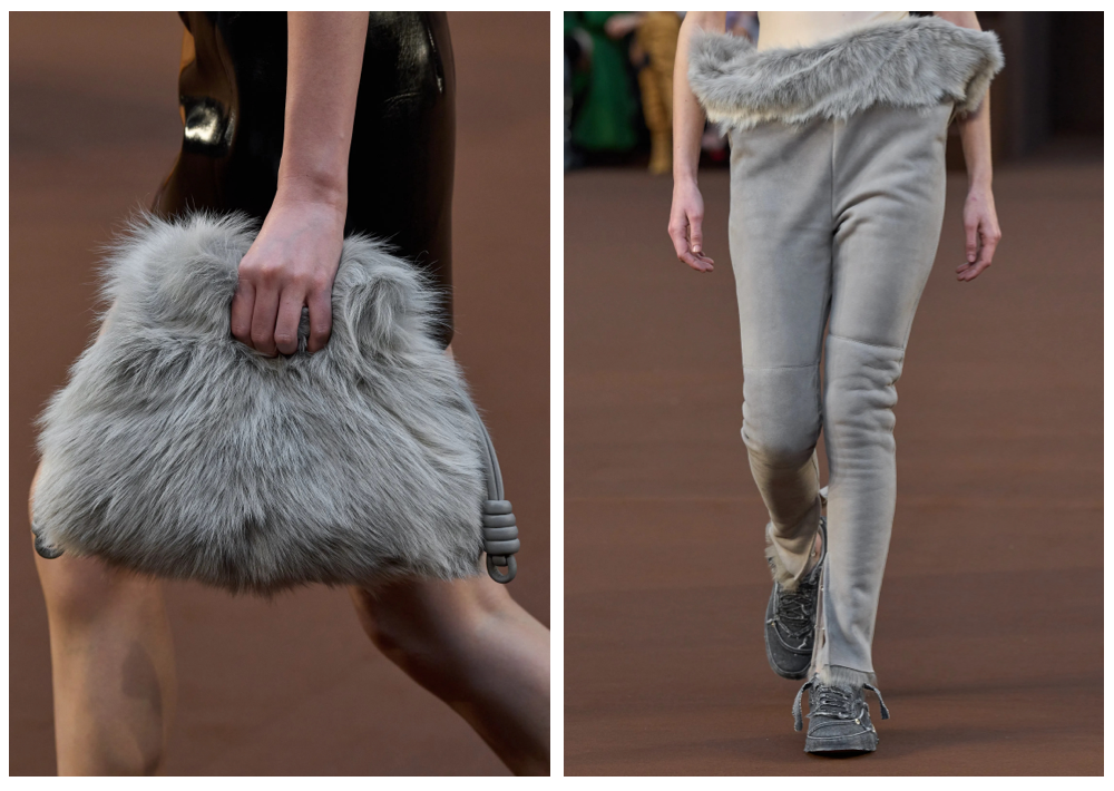 Loewe对毛毛巧妙的运用可谓是碰撞得绝妙。漆面背心短裙冷艳十足,但搭配了一只灰色毛毛手袋,酷劲瞬间就被软乎乎地降了温。“怕冷星人”离不开的加绒裤,也被大玩了一把“反向皮毛一体”, 将麂皮绒一面外穿,毛茸一面内穿,并露出腰间的毛圈,实用性很强。