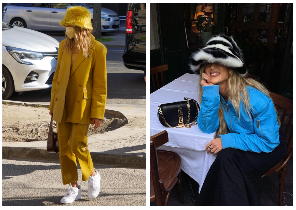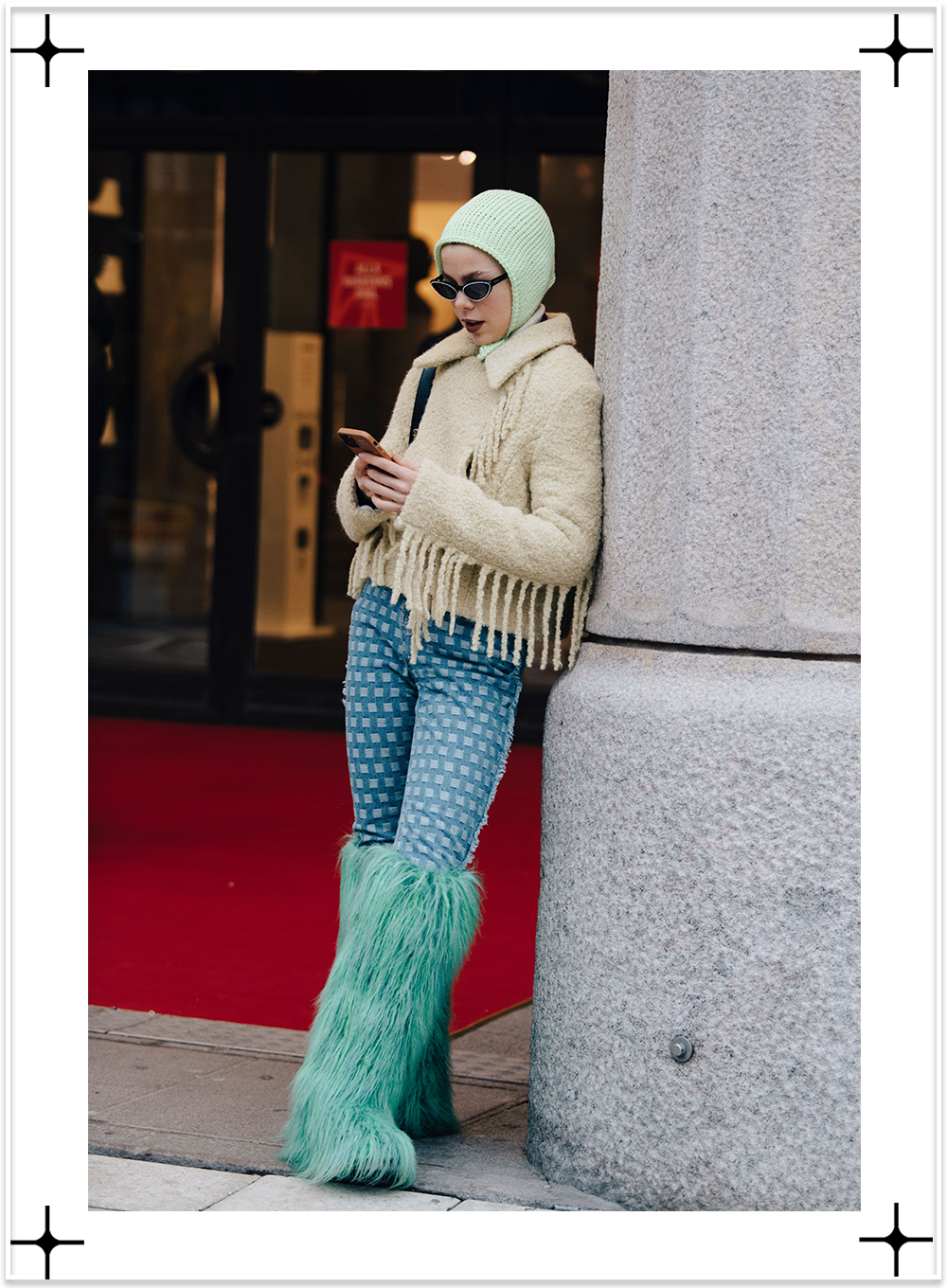 无论是清淡色系的纯洁可爱,还是各种高饱和度纯色的狂野搞怪,长毛雪地靴都能让造型更加丰富有层次感,给你的冬日穿搭增添一丝温柔暖意。另外,今年冬天必不可少的保暖神器,那就当属毛毛质感的渔夫帽和盆栽帽。与其他帽子的种类相比,它们的百搭系数和抗风指数一样高。比如渔夫帽的帽檐圈越大,盖住脸部的面积就会越多。特别是一些动物图案的款式,可是辣妹们冬天的心头好,自带狂野感的滤镜。而盆栽帽更适合小个子和大头女孩,相比渔夫帽,它的线条更简洁流畅,也不会太厚重,相对自重感比较轻薄,特别是浅色款式,完全不会压个子,视觉上也不用担心有头重脚轻的问题出现。