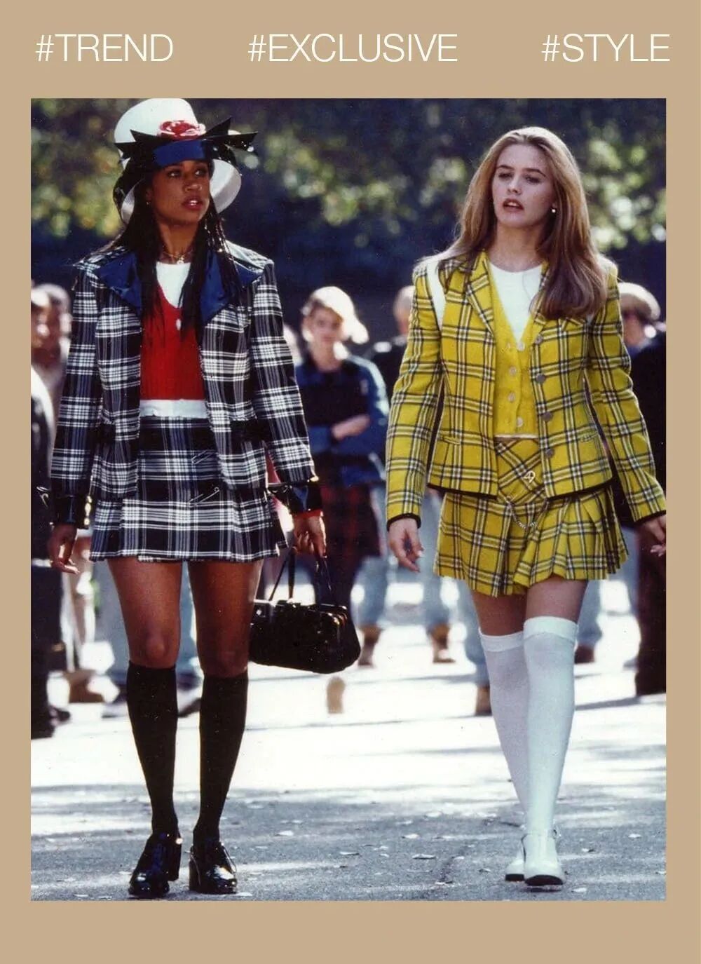 绝大多数美国女孩都是在环绕播放的青春校园剧陪伴中长大的,这些轻松时髦、造型多变的剧自然而然成为了她们的时尚启蒙。这些剧里人物服装的共同点是颜色高饱和,元素多且密集。《Clueless》是其中非常具有代表性的一部,里面出现了许多经典的美式校园风穿搭。亮黄色的格纹西装&半裙套装今天看都不过时,跟正回潮的美式复古风相似度90%。影视剧带来的潮流趋势越强烈越短暂,不会长期保持同一种风格,更不会帮每个人判断照搬这种风格是不是适合你。跟着影视剧和时尚Icon不停追逐潮流的后果可能是:当追逐成为惯性后,会很难维持住一种稳定风格。但潮流本就没有一种答案,无数次尝试的过程和每一次新鲜的触碰对有的人来说或许才是最有趣的部分。