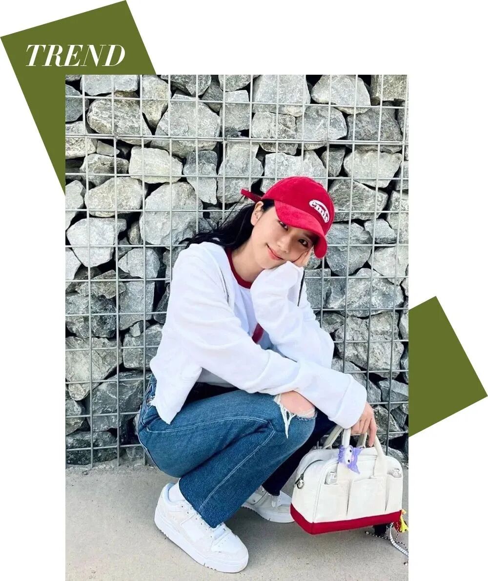 点缀一只红色手袋,不需要绞尽脑汁便可以扭转沉闷的局势。智秀用红色棒球帽和红边包包颜色呼应,清爽造型谁看了不心动?