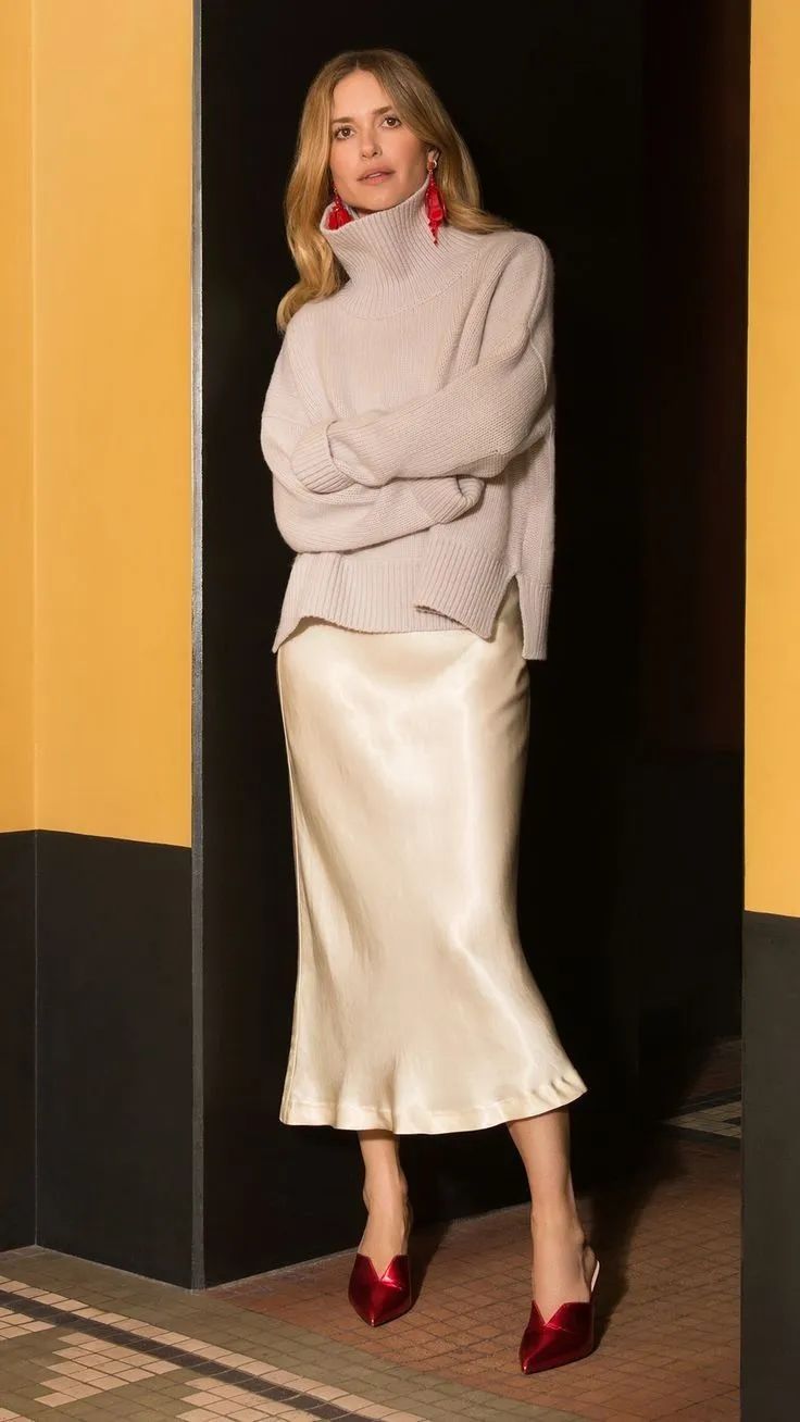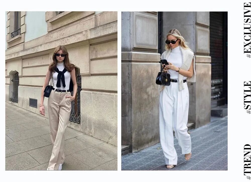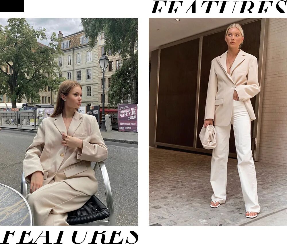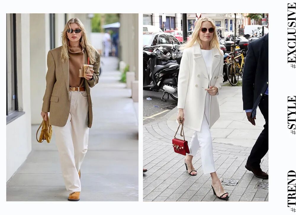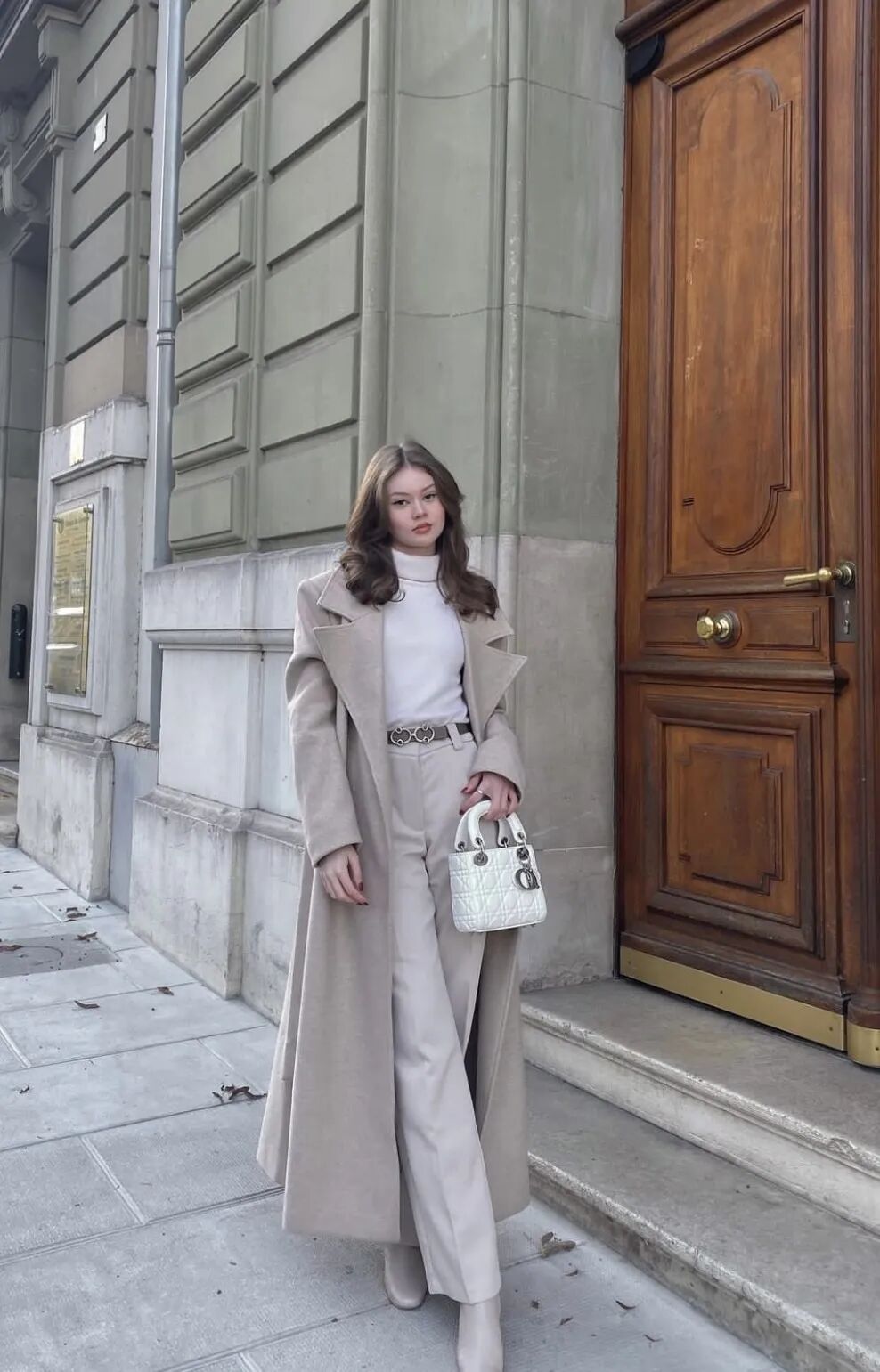 避免大面积的Logo和花哨的图案,追求细节与品质,秉持一种“质感至上”的穿衣原则就比别人领先一步get到其精髓了。软糯的高档羊绒衫是老钱们钟爱的材质,搭配精心打理过的真丝裙装,知性得体间透露着由内而外的自信,这一套很适合邀请亲密的朋友们来家里小聚时的穿搭。把基础款穿出质感和格调,更能彰显一个人的气质与品味。裁剪精良、修身板型的女士西装,可以很好地展现出女性的力量感,与高领羊毛打底进行搭配实际上更能凸显“老钱气质”。选择低饱和度的色彩,进行同色系的混搭,如黑白灰、米色、藏蓝色或驼色。单穿也是她们钟爱的搭配,像极了法国女性那种不刻意打扮的慵懒洒脱,却又处处散发着优雅的格调。在北方的朋友们,将西装换成更为保暖的羊绒大衣、风衣也能达到同样的效果。各种基础单品放在一起叠穿也是时尚Icon们日常的首选,另外,由浅到深的叠穿,在打造高级层次感的同时也不显臃肿,利用好“叠穿法则”人人都可以穿出老钱味十足的高级范儿。等天气回暖一点,纯色T-shirt+衬衫+阔腿裤的组合轻松营造出老钱度假风的随性,低调却不失优雅~还有一个小tips, 可以在肩膀绑上一件薄羊毛衫,是标准老钱穿搭典范没错了。总而言之,注意整体的干净不杂乱,再结合上自身的气质,就能轻松拿捏住这种风格了。