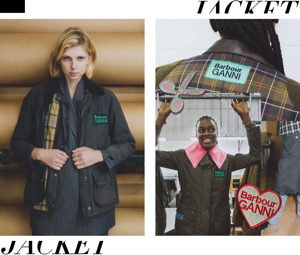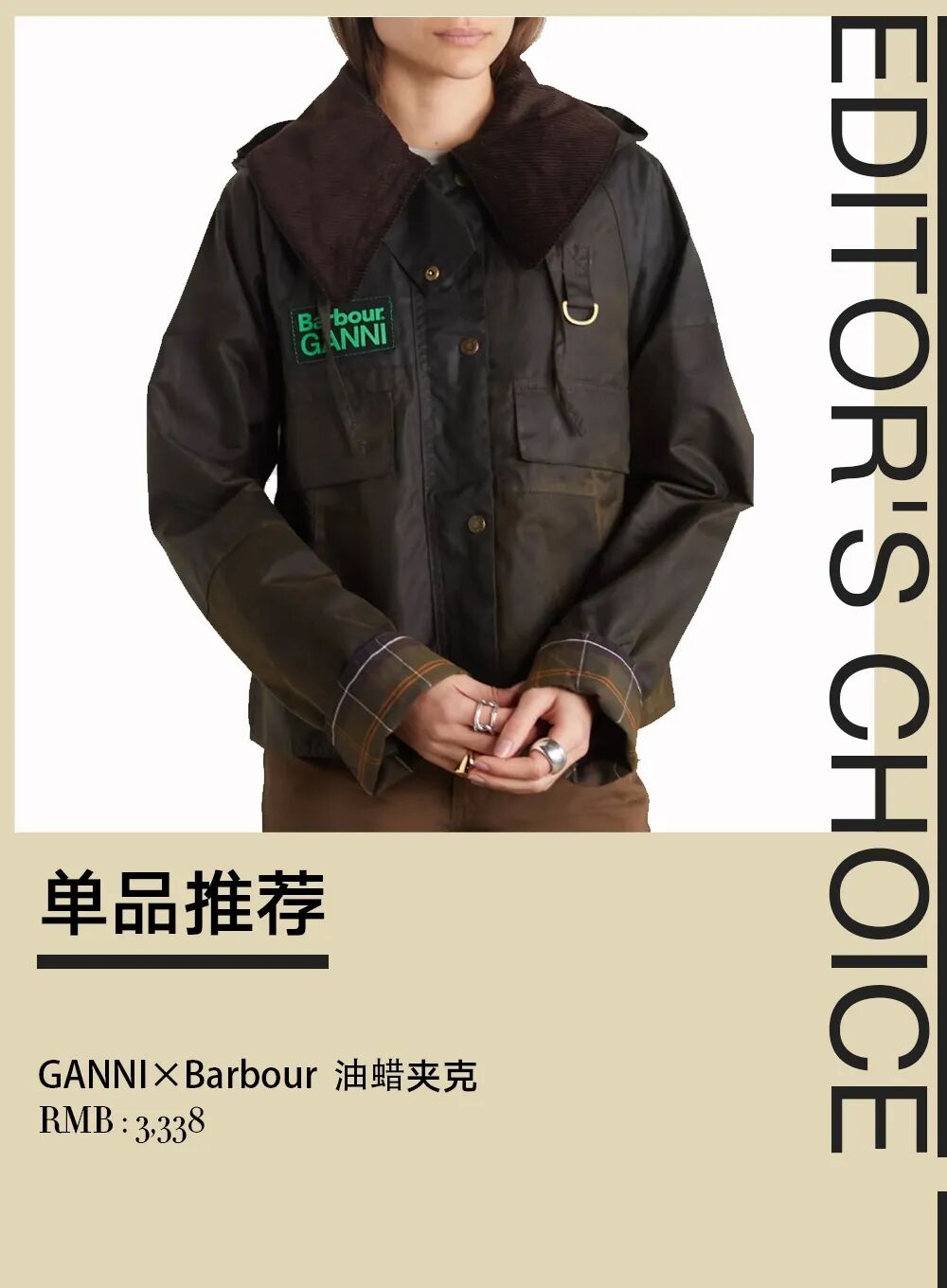Barbour的火热程度从这几年它和各种时尚品牌的联名就可以看出。今年和GANNI的联名就用回收的Barbour夹克进行了可爱的remake,不仅符合两个品牌的环保理念还让油蜡夹克更有年轻感。