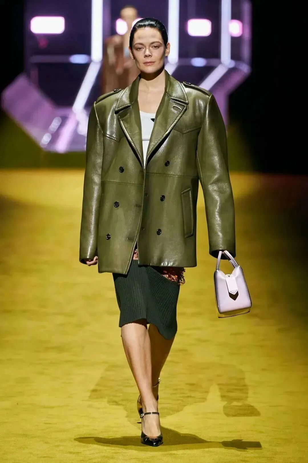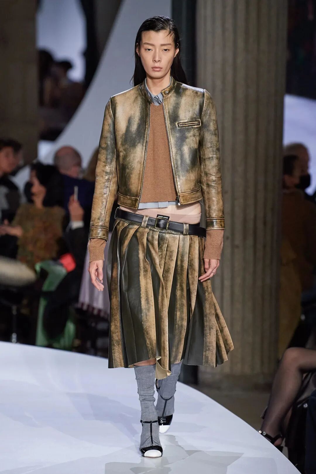 更符合Miuccia个人风格的Miu Miu则构建了一个她认为眼中年轻、特立独行的年轻时髦女孩模样。不带有任何讨好性的美,“坏品味”低腰混搭优雅百褶裙,穿夹克的女孩野蛮而美丽。