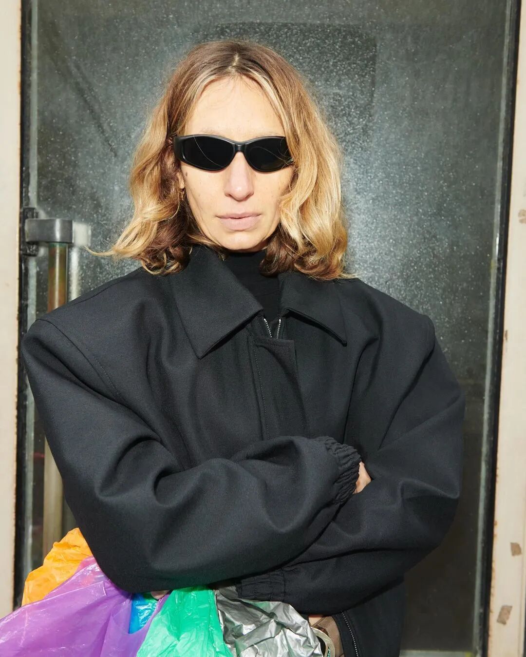 博主Camille用一条Prada粉色拖尾短裙搭配做旧夹克,做旧的泛白纹理和矜贵的缎面;机车夹克和华丽拖尾设计;oversized的宽松廓形和裹身短裙——三组绝对反差让这身造型成为皮夹克穿搭中一眼难忘的look。