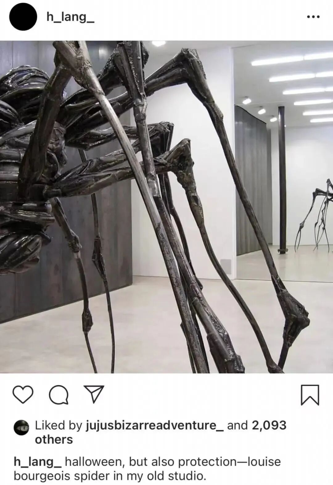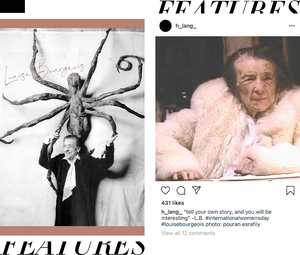 她在艺术灵感蓬勃而发的那年创作了“蜘蛛”系列,也在近年与Helmut Lang相识,你可以从她的衣橱中找到很多Lang的作品,而Lang口中的那份强烈的、无条件的情感联系也在不经意间促成了品牌众多经典的时尚单品。