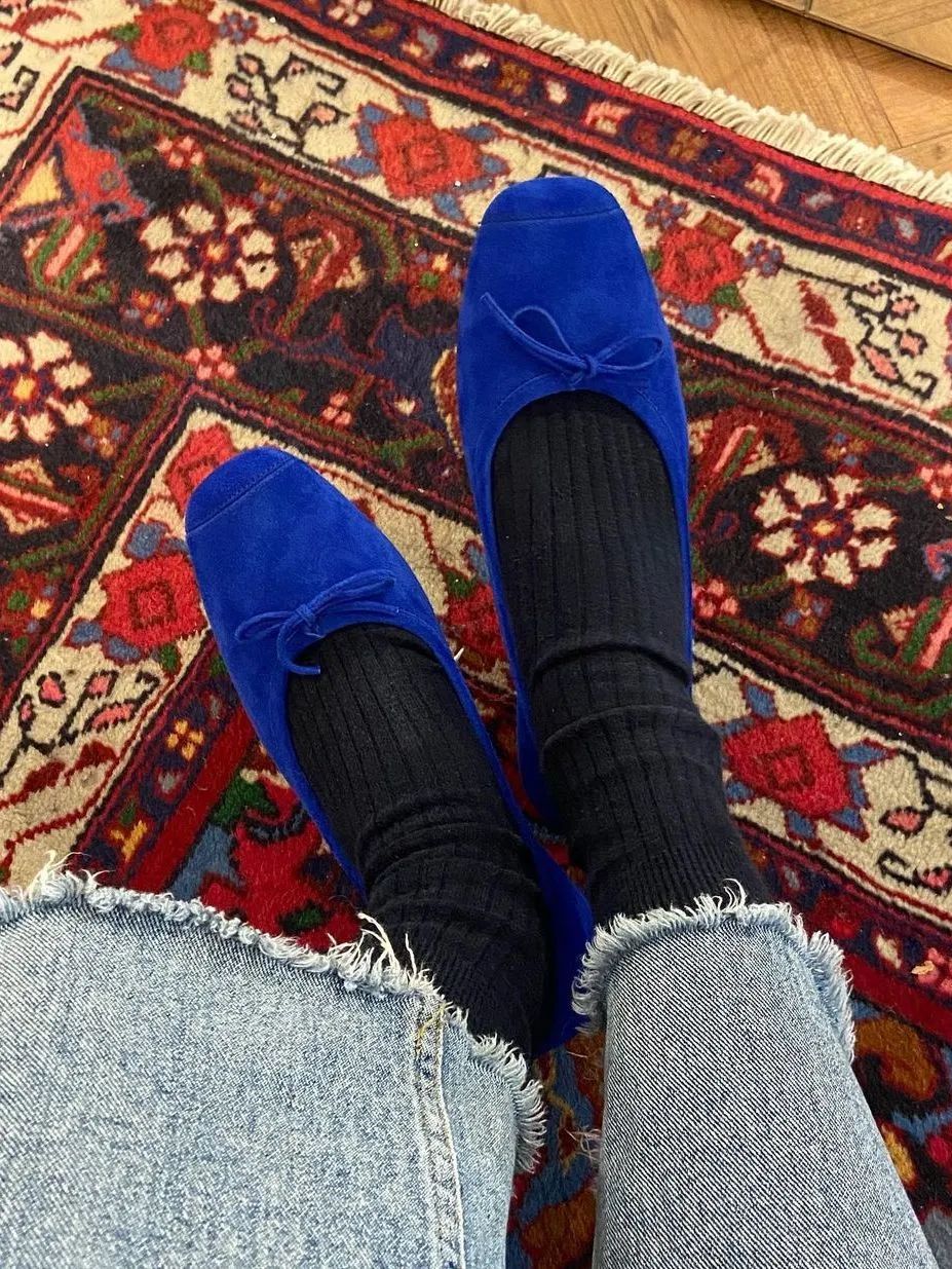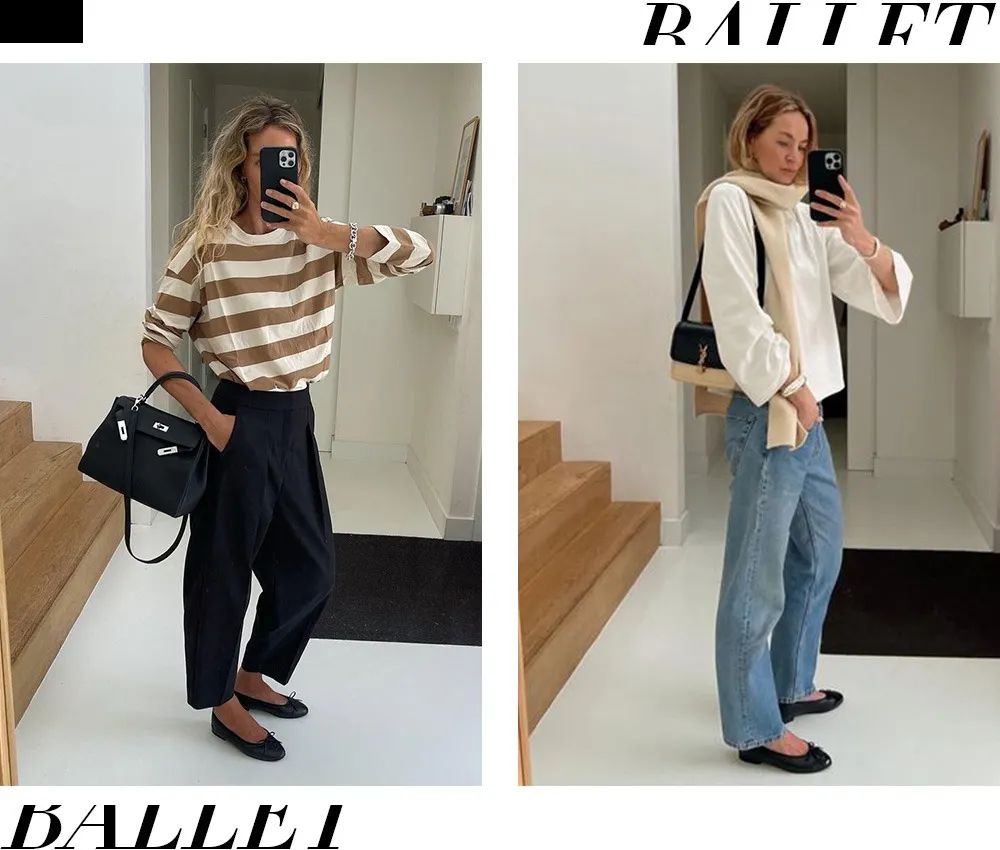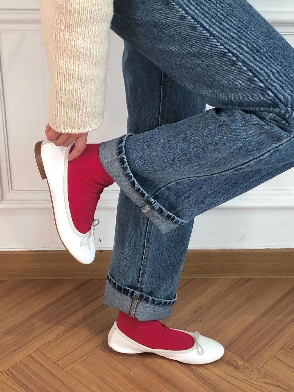 牛仔裤与芭蕾鞋可以成为工作日OOTD的组合,搭配不同颜色的袜子便又是一身新的look。