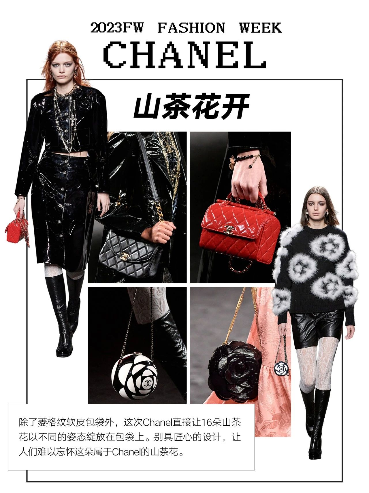 球形包袋运用几何构图让山茶花饱满圆润,山茶花形的包袋立体感十足,亮片交织成的山茶花给秋冬带来了活力,格子山茶花与黑白格包身融为一体。