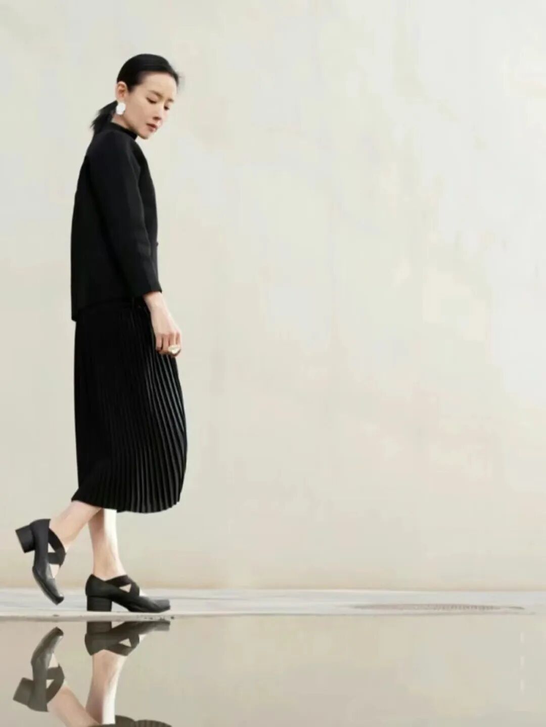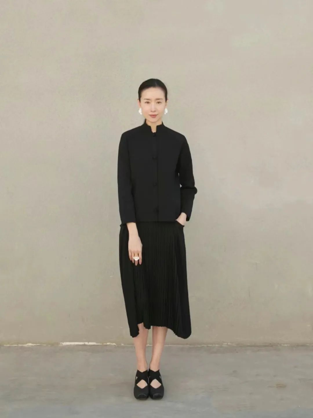 比如这身黑色立领中式上衣搭配同色风琴百褶裙的look就十分值得新手借鉴,踩一双克制的绑带芭蕾单鞋,诗意和浪漫即刻跃然褶裥。