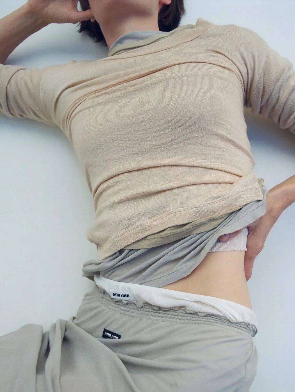 Miu Miu将不起眼的打底引领成时尚潮流。恰到好处的透视和让人心生轻松的大地色,搭配上克制的logo,这便是这件打底衫风靡博主圈的原因。