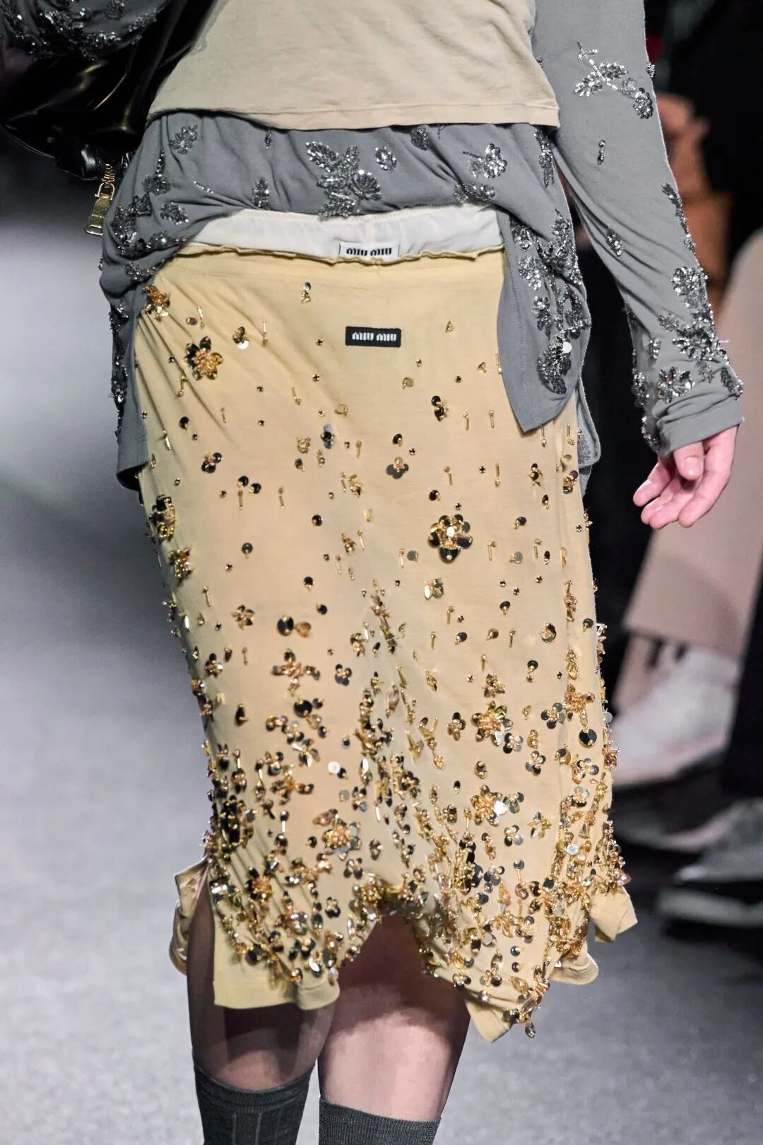 Miu Miu的打底叠搭细节上才见造型师的功力。数不清有多少层的堆叠裙摆、随意塞在精致串珠衬裙的柔软长袖、内裤边外露的知识分子风中裙以及丝袜下隐约可见“不小心”没整理好的上衣边。这些看似随意的造型都经过了精心的设计,简单的打底也可以搭配出八百个心眼子。
