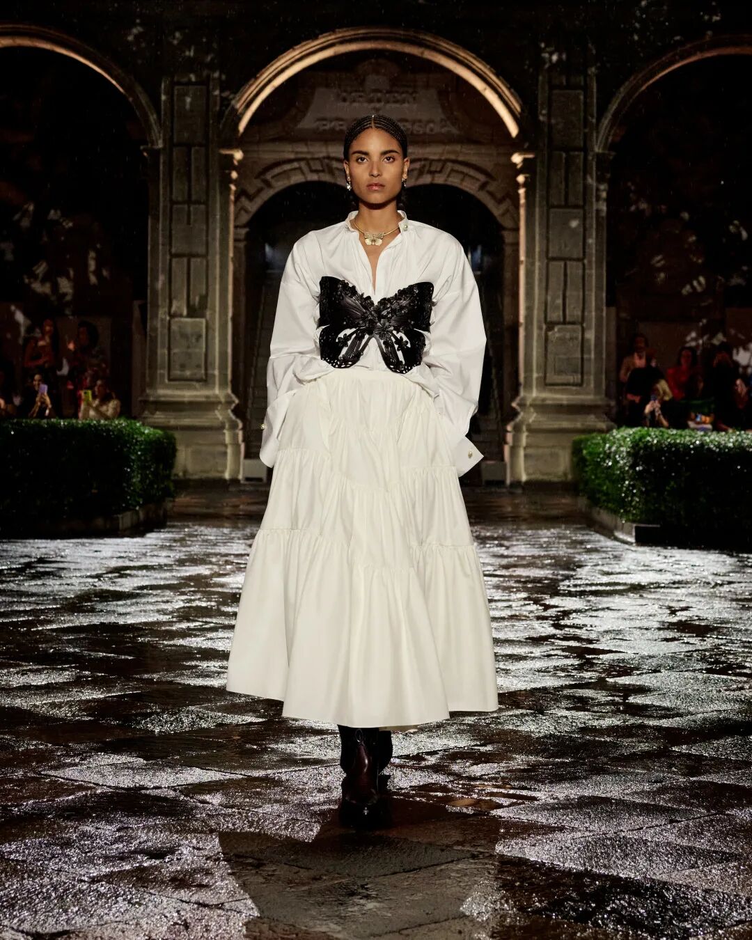 蜕变蝴蝶也是本次成衣秀的重要元素。茧形服装如同装点残缺躯体的珍贵珠宝盒,与多款印花相得益彰,呈现色彩缤纷、形态各异的蜕变蝴蝶图案。飞蛾亦翩然映现于系列服饰之上,这个灵感源自迪奥典藏中由安德烈·布罗辛·德·梅(ANDRÉE BROSSIN DE MÉRÉ)绘制的手稿。