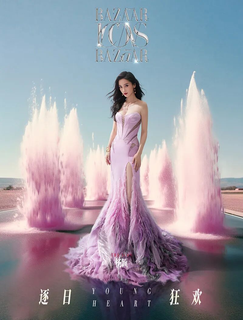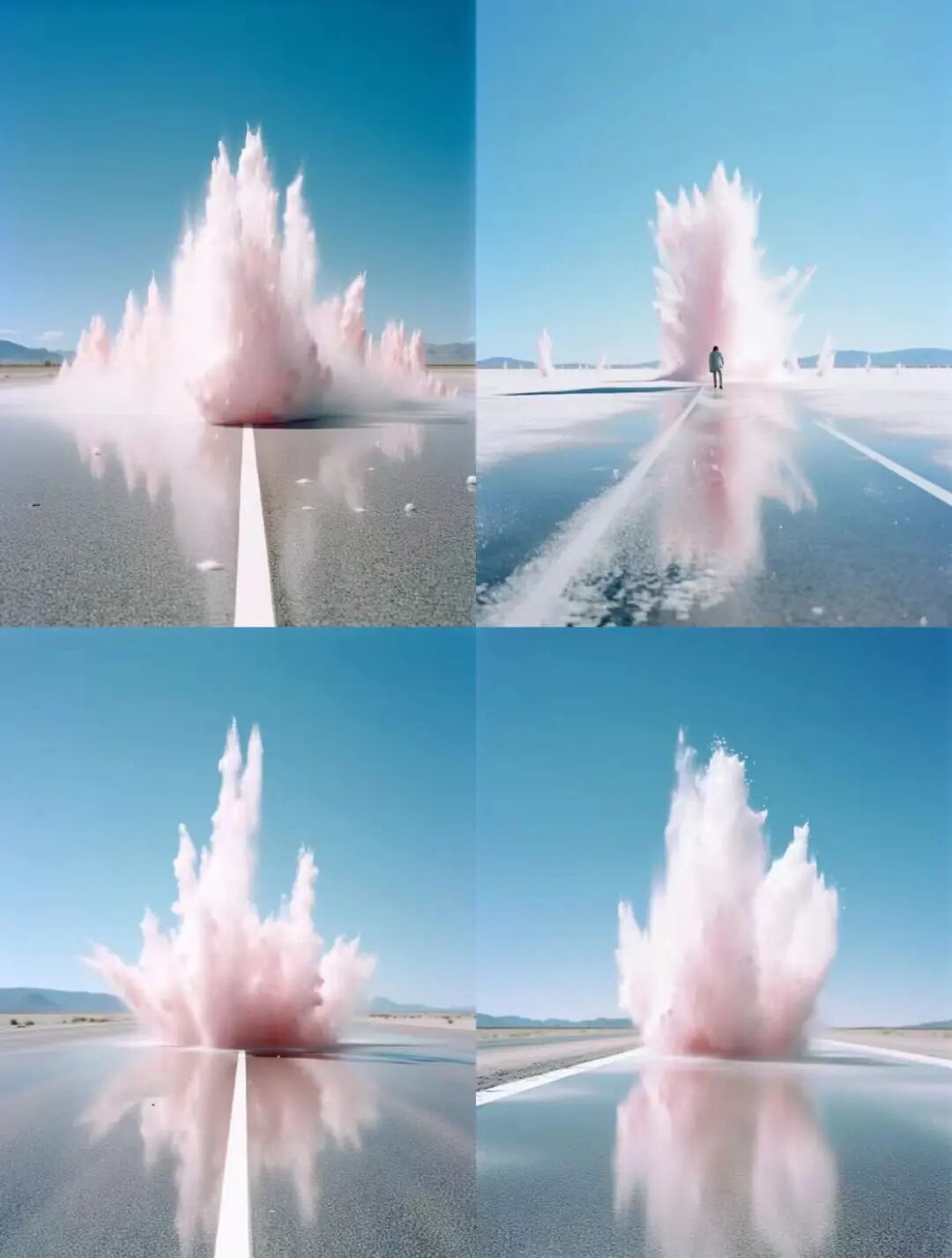 最特别的是杨颖那张公路喷泉。我们最开始的创意是“沙漠喷泉”,但在沙漠里,那个喷泉一直不是很好看。那天很巧,网易云随机播放到了老鹰的那首《加州旅馆》,我就把那个关键词改成了“高速公路”,结果出了第一张图就很OK,我觉得创作中的这种时候非常有魅力。