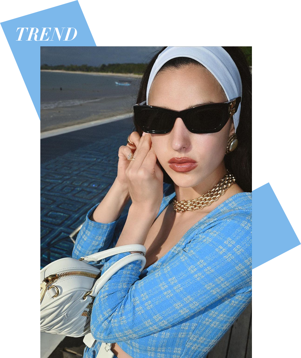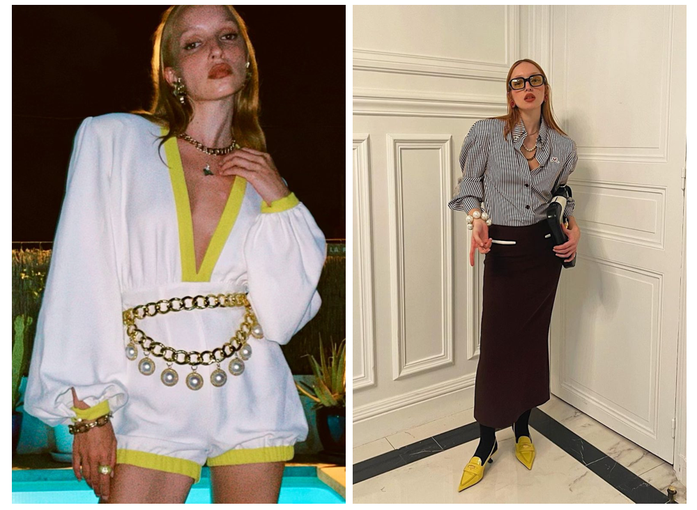 20世纪80年代经典的白珍珠与复古深棕色墨镜,有造型感的同时能完美地融入每一套穿搭、每一种色系而不造成冲突,并且当看到这个组合时便知是Labanca,这种如名片般的风格记忆点,或许正是她的巧妙所在。