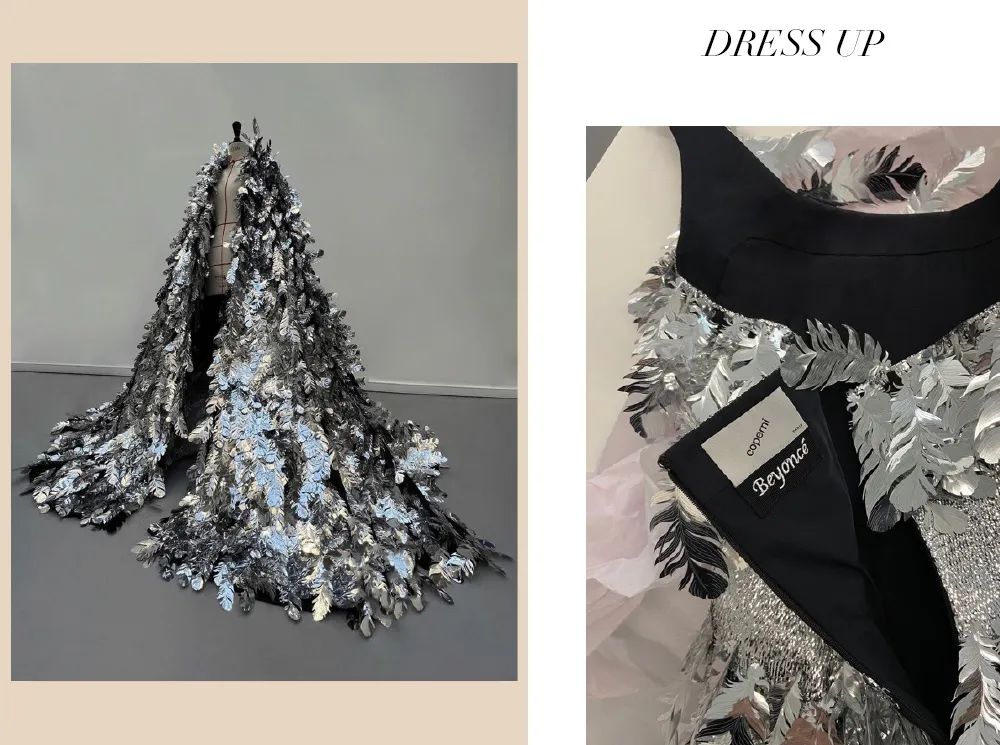 碧昂丝身穿银色亮片斗篷,仿佛天神降临人间,这个造型是由法国时尚品牌Coperni特别定制。