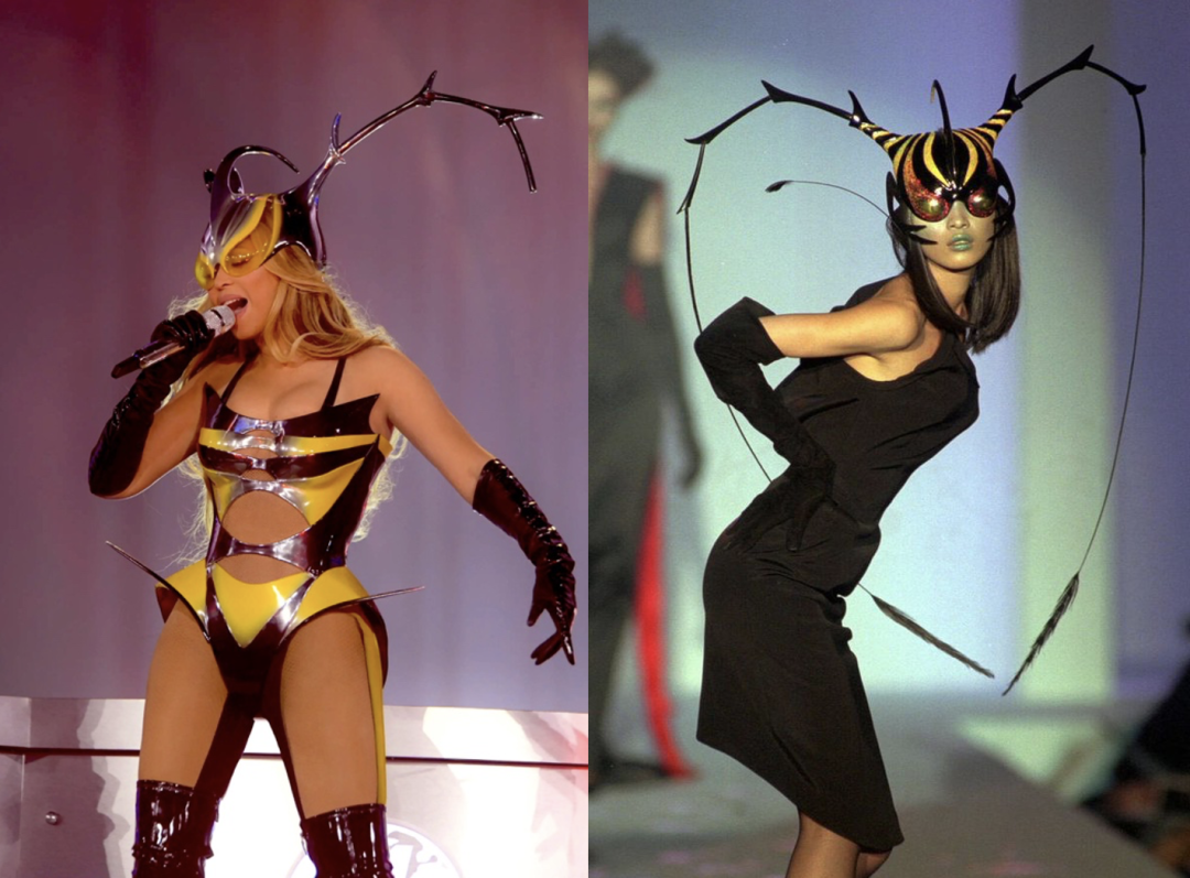 这件由Mugler现任创意总监Casey Cadwallader为她特别定制的服装,灵感来自于Thierry Mugler 1997年的高级定制秀场,巧妙地融入了昆虫的特征,如触角、翅膀、复眼等,营造出一种强大和华丽的风格,致敬经典的同时也在玩一种新的创新。