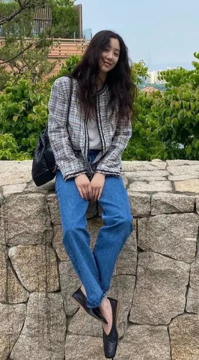 除了追求完美的不完美,韩女在氛围感穿搭上有一套自己的逻辑。她们很少用色彩的冲撞来制造视觉重心,对于她们来说,过于复杂、设计感的单品也是冗余。韩女推崇把基础款穿出层次,利落简洁的剪裁再加上点用细节装点的“心机”就够了。“微笑女王”郑丽媛的私服中频繁出现的白T恤和牛仔裤,闺蜜团之一孔孝真跟大多数韩女一样偏爱黑白配,但她们都会在常规款式的基础上增加细节来凸显质感。金高银的日常中经常出现的衬衫和西装,都是有挺阔肩线的类型,流行趋势再火热,也需要为“适合自己”让步。