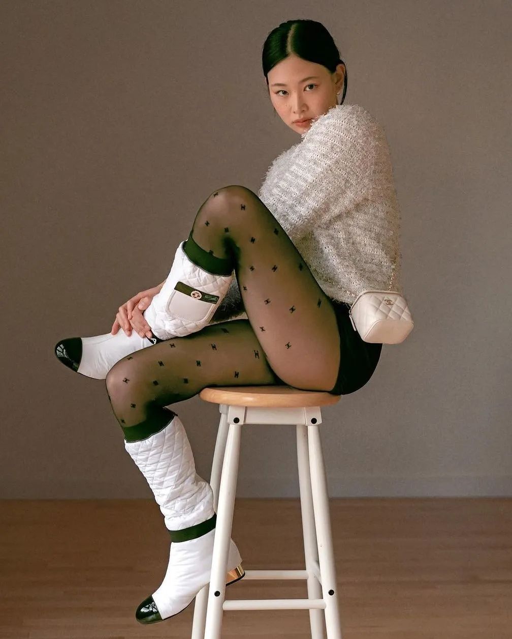 首先要推荐的是经典永恒的Chanel双C logo印花丝袜,搭配经典款套装便显得优雅又知性,博主Christie Tyler这身就格外智性时髦。