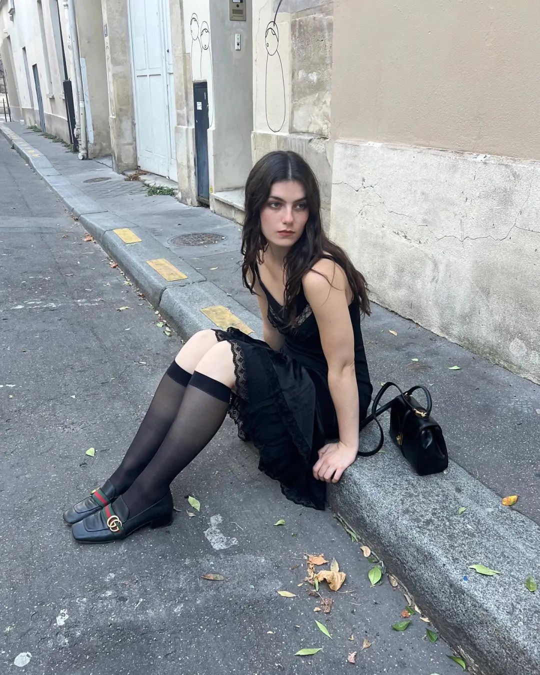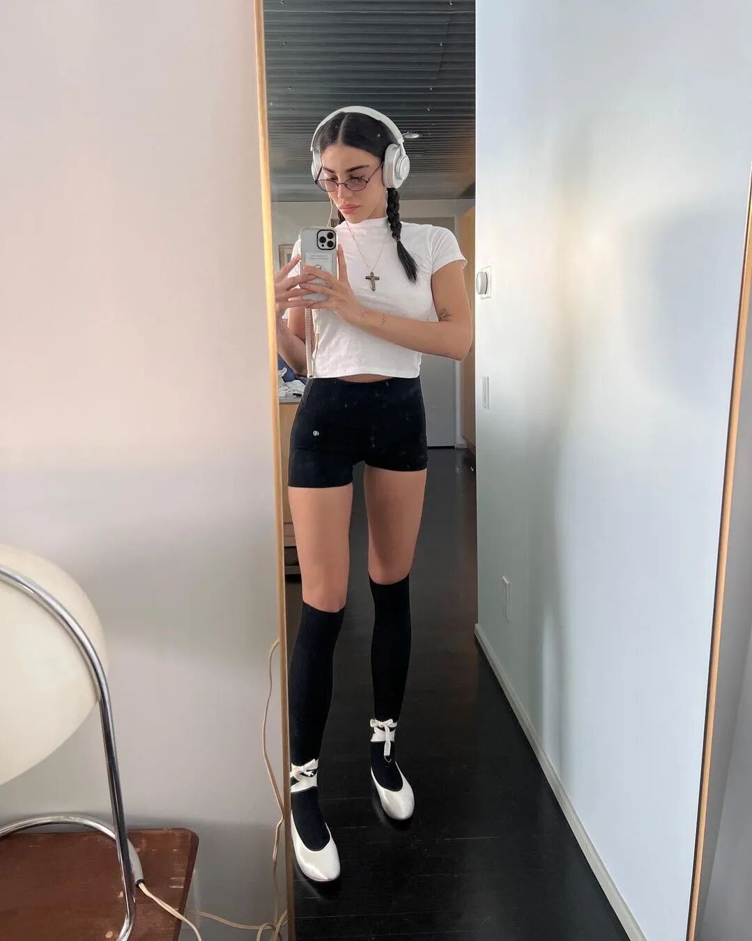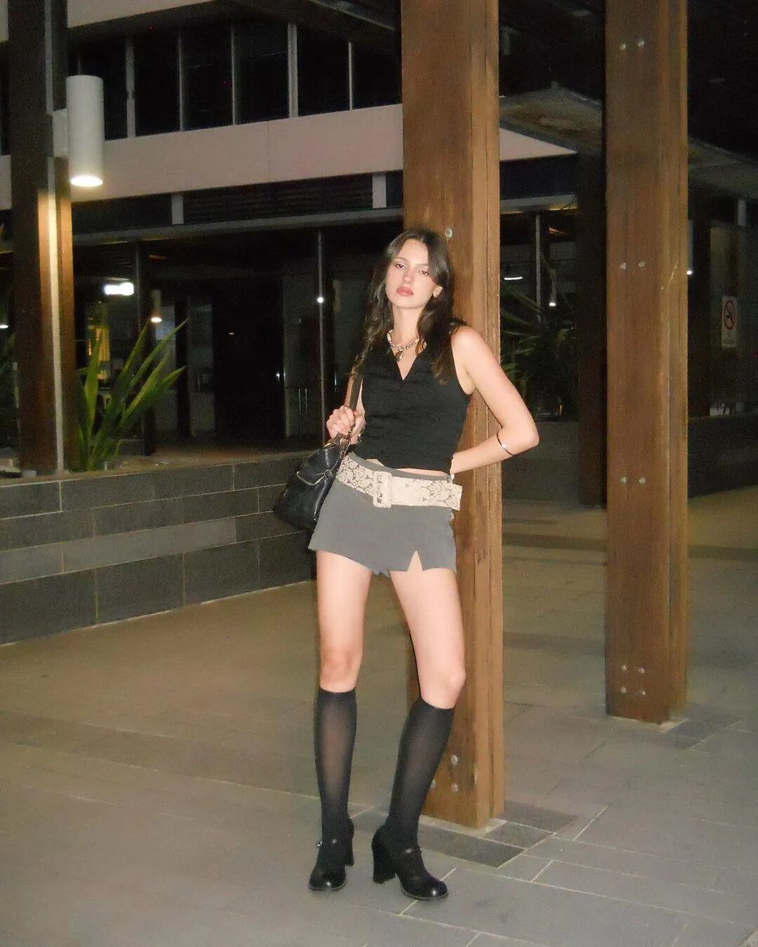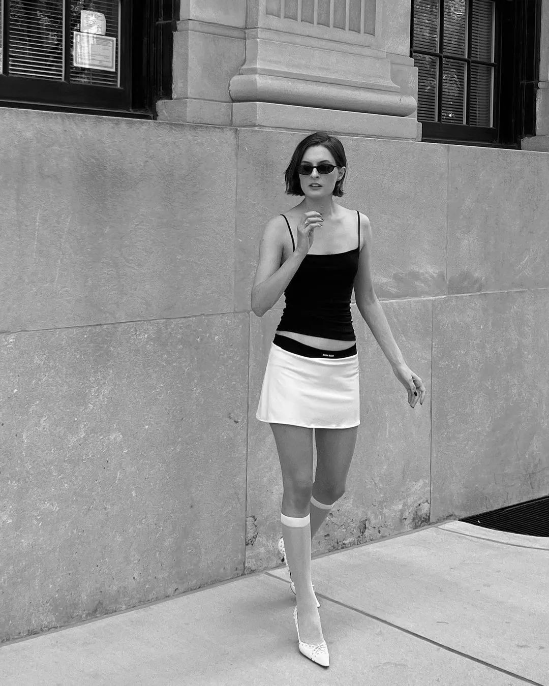 时下流行的Y2K千禧风格同样可以依赖一双及膝小腿袜打造,像博主Diana Avel这身便是通过这款单品highlight,上下色系呼应,整个人看起来既慵懒又时髦。
