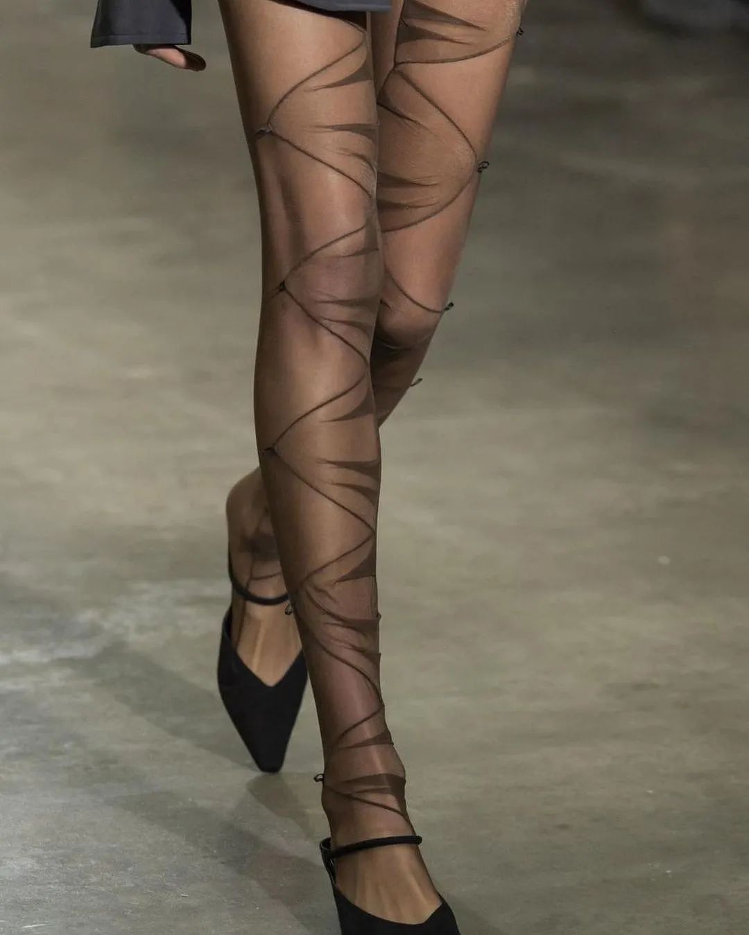 厌倦常规款式的话,也可以在小众风格里找找灵感,比如意大利设计师品牌Maison Soksi以透视和解构设计打造的丝袜单品,更能给造型添加点出其不意的风格。
