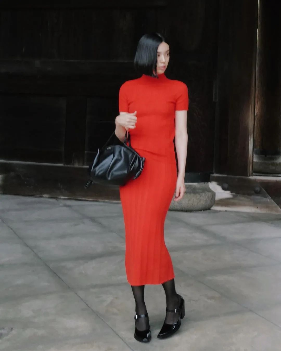 博主加藤顺子则是用一袭红色her senses针织套装搭配及膝款小腿袜,最后用一双优雅的尖头皮鞋完装,整体造型干练清爽。