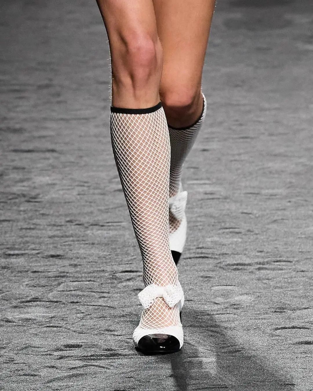 纯棉材质或渔网材质也很吸睛,Chanel去年秋冬推出过的镂空款小腿袜就是将时髦的香风注入渔网元素中,黑白拼色更是耐看高级。