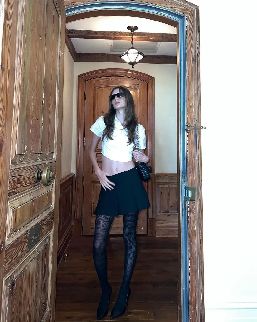 除了百搭显瘦的黑色,干净清新的白色同样值得尝试,Christie Tyler另一套造型便是用白色微透小腿袜作为点缀,瞬间带来简约高级的视觉效果。